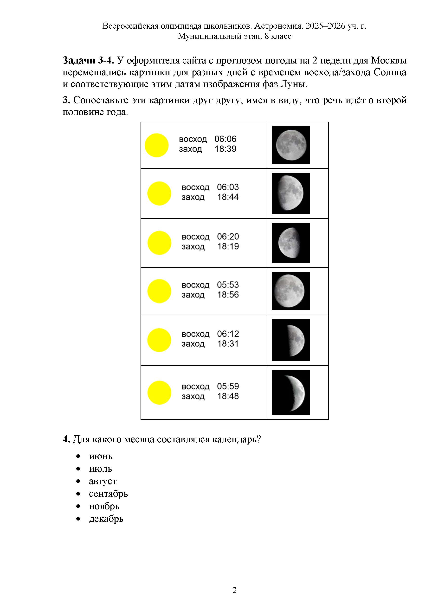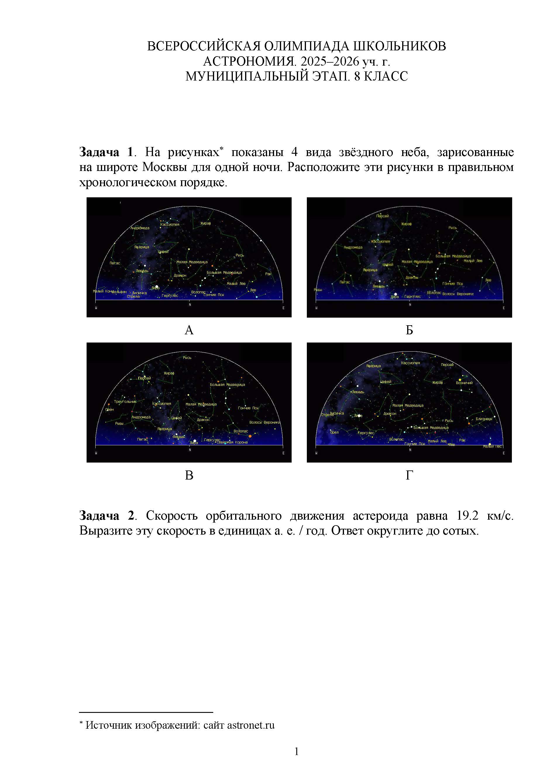 Всероссийская олимпиада школьников (ВсОШ) муниципального этапа по Астрономии. Официальные задания, ответы и решения для 8 (восьмого) класса (задания и ответы)