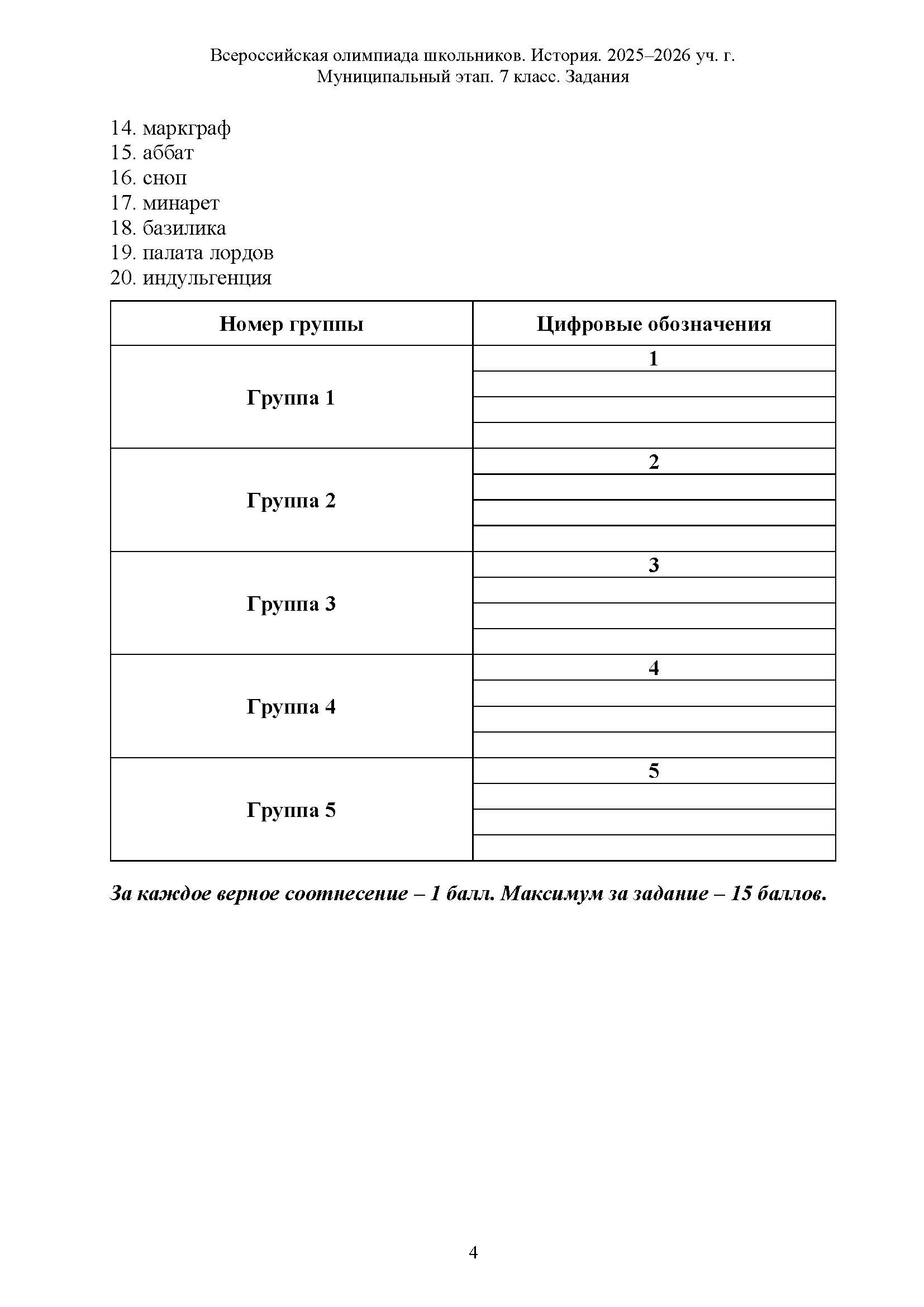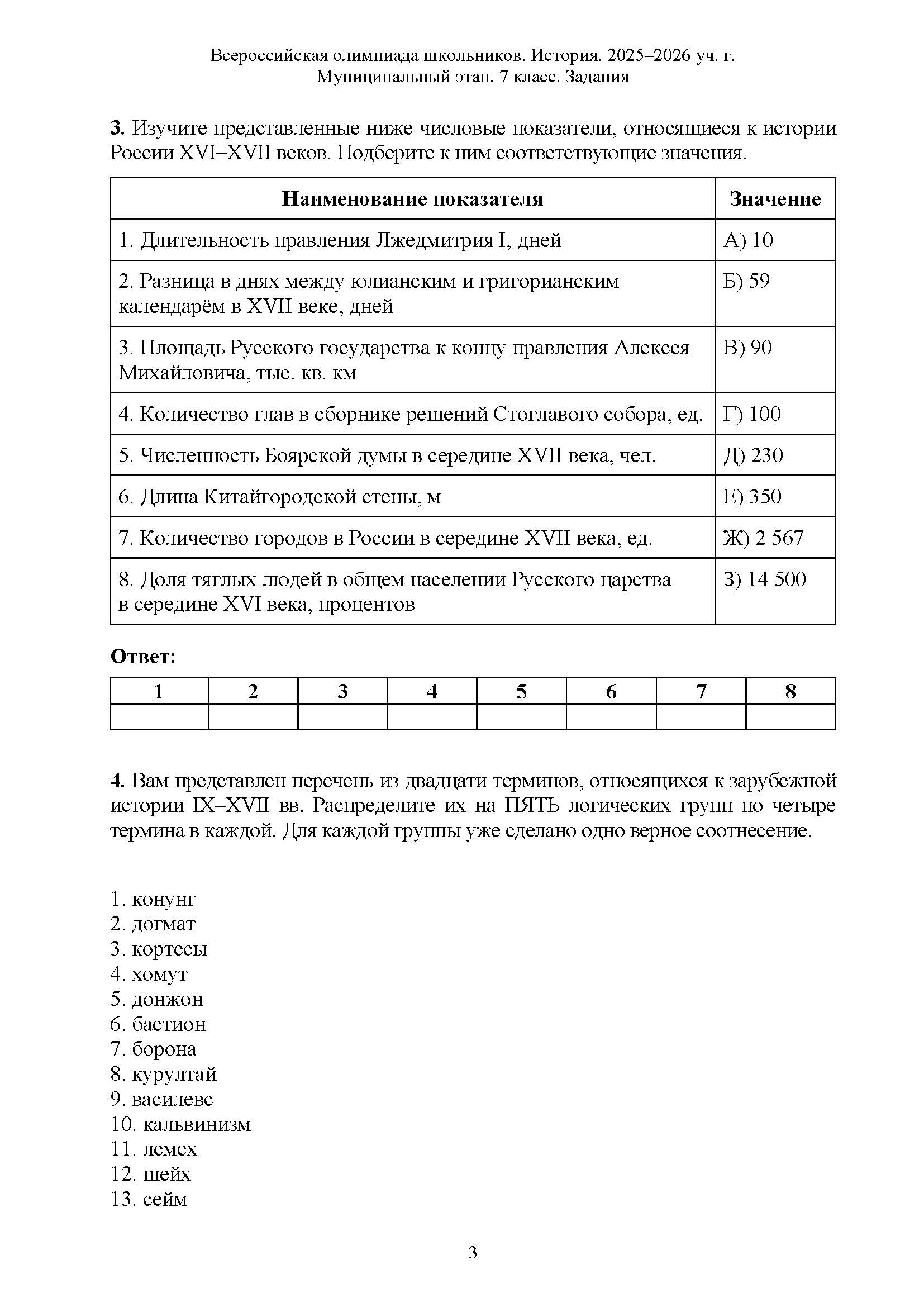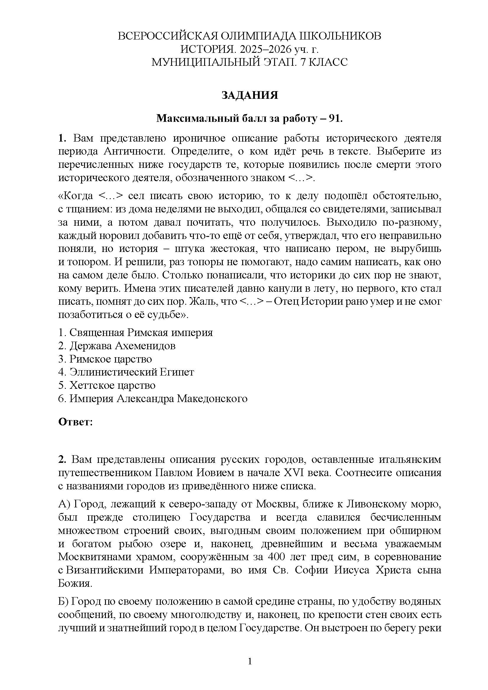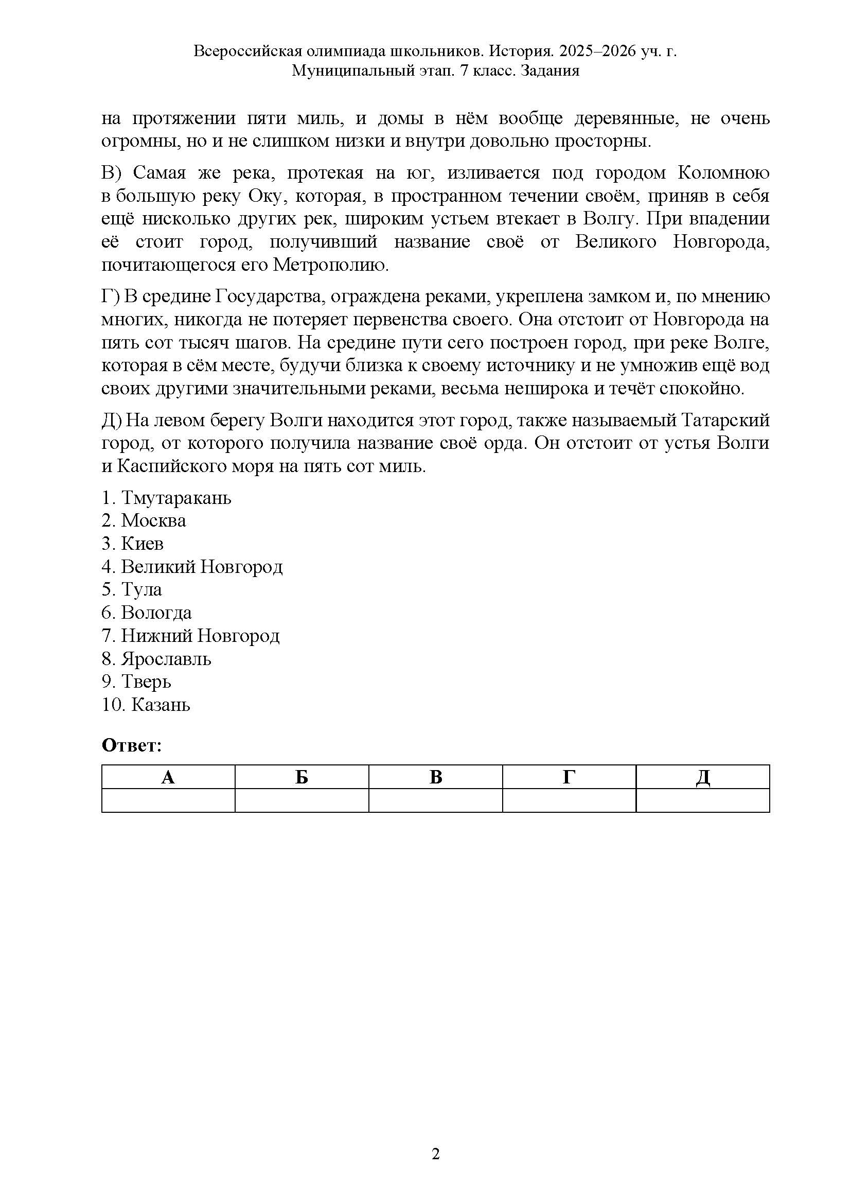 Всероссийская олимпиада школьников (ВсОШ) муниципального этапа по Истории. Официальные задания, ответы и решения для 7 (седьмого) класса (задания и ответы)