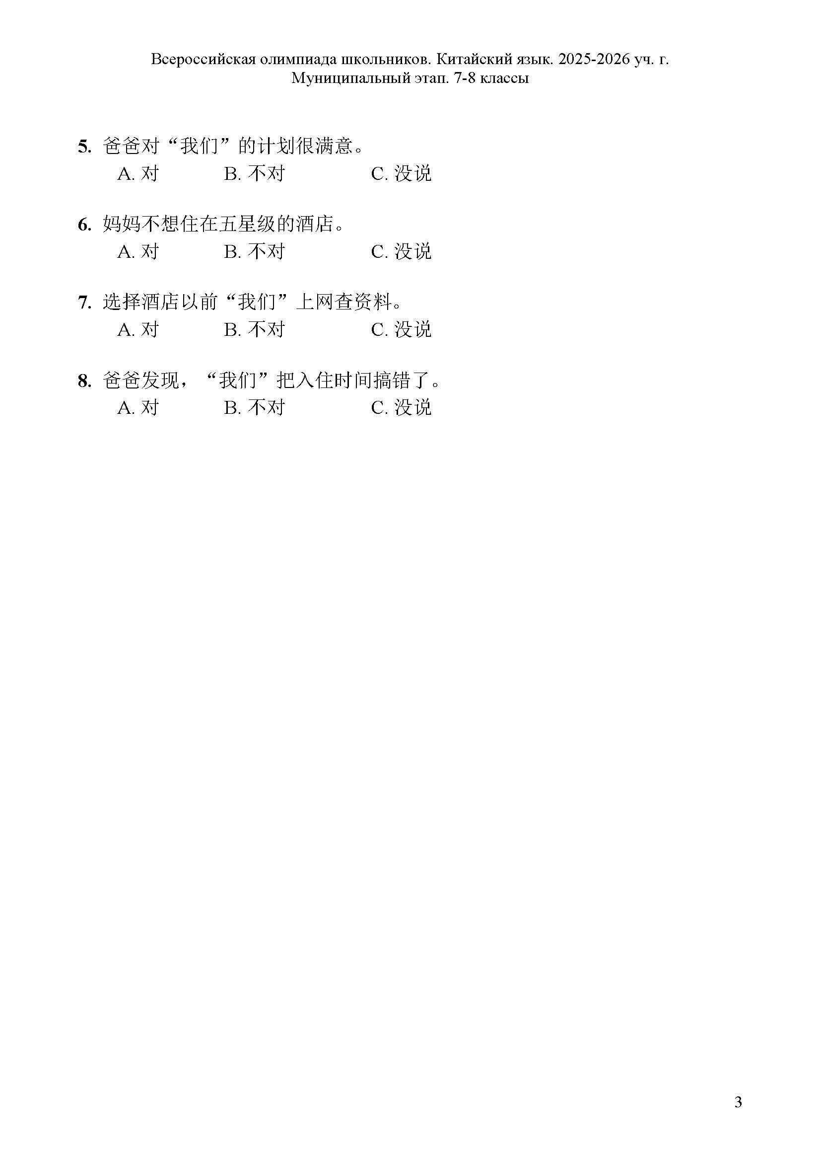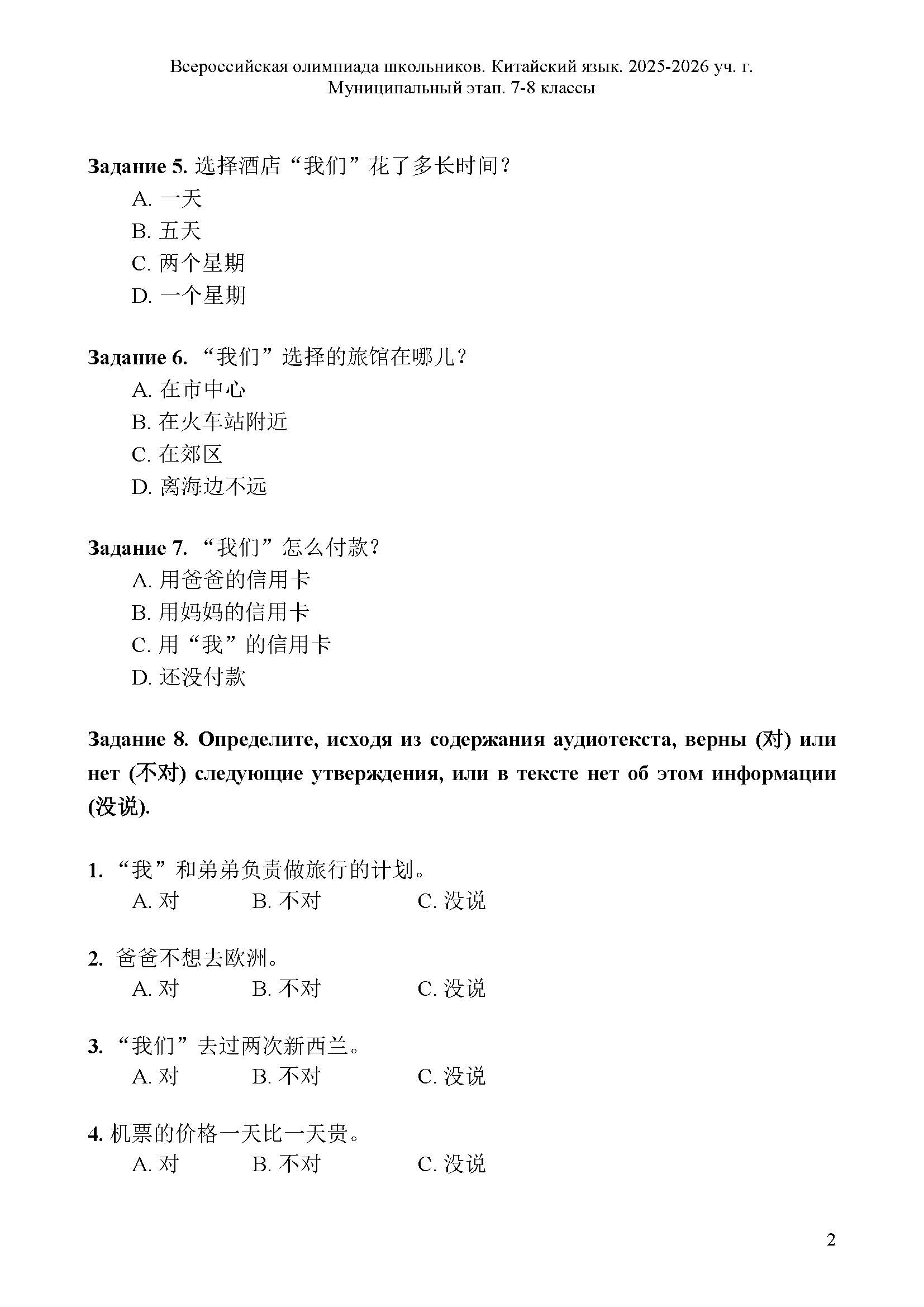 Всероссийская олимпиада школьников (ВсОШ) муниципального этапа по Китайскому языку. Официальные задания, ответы и решения для 7 (седьмого) класса (задания и ответы)