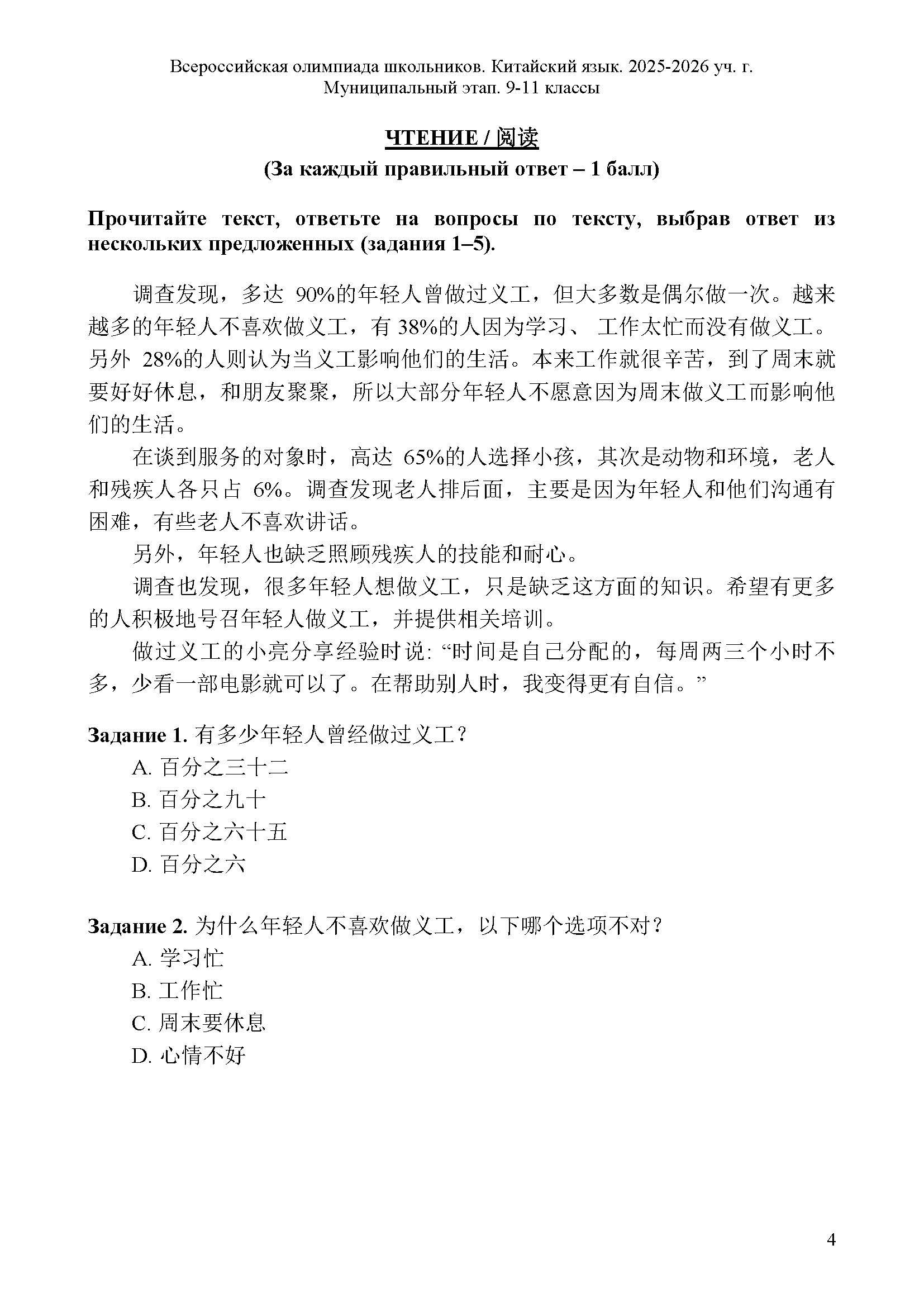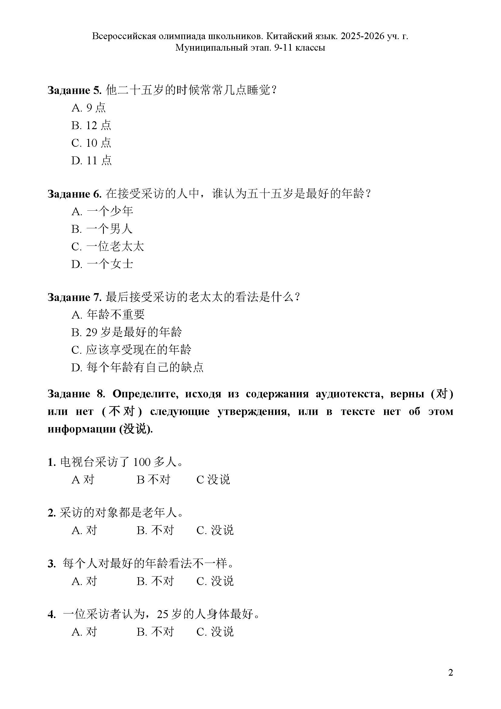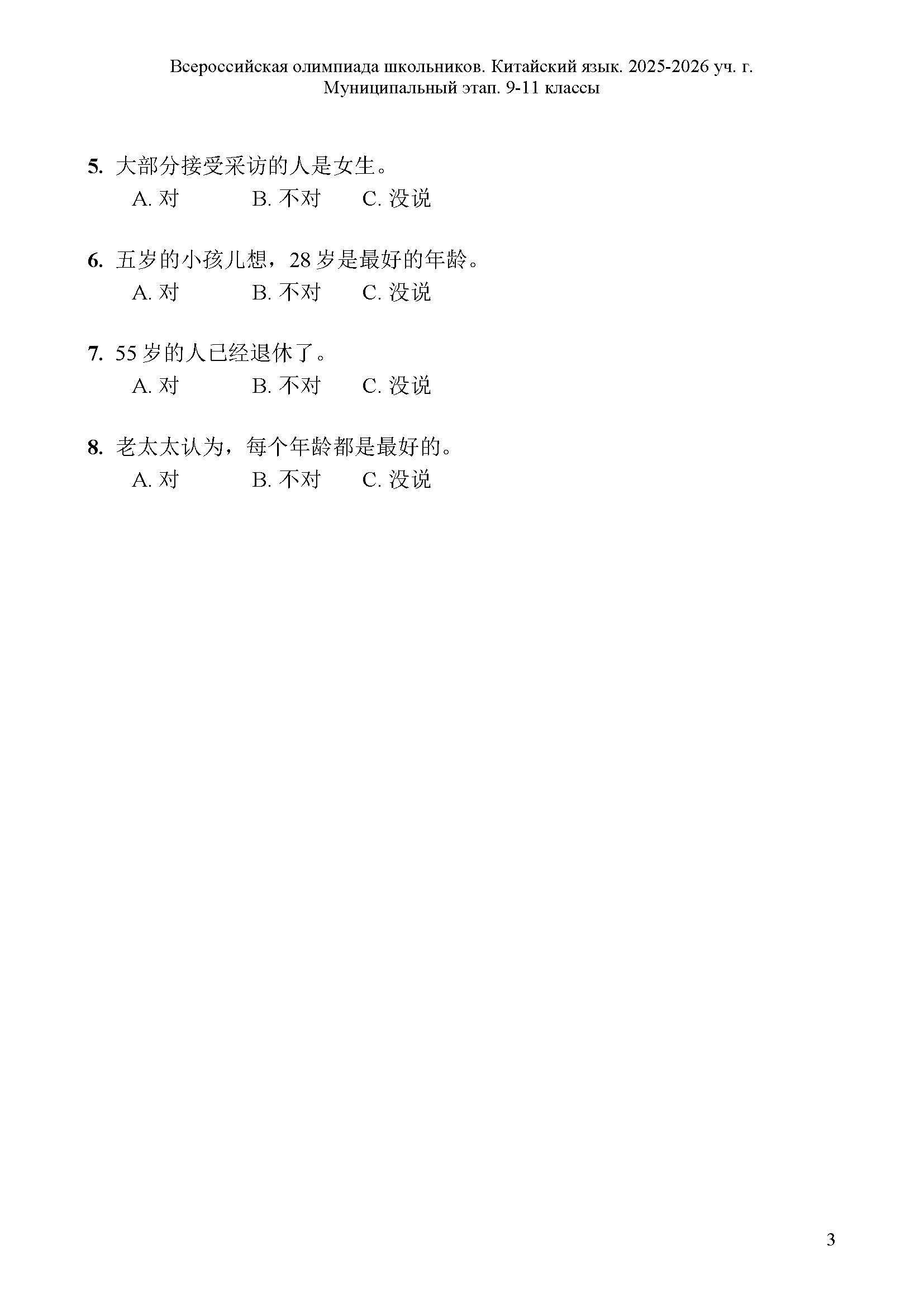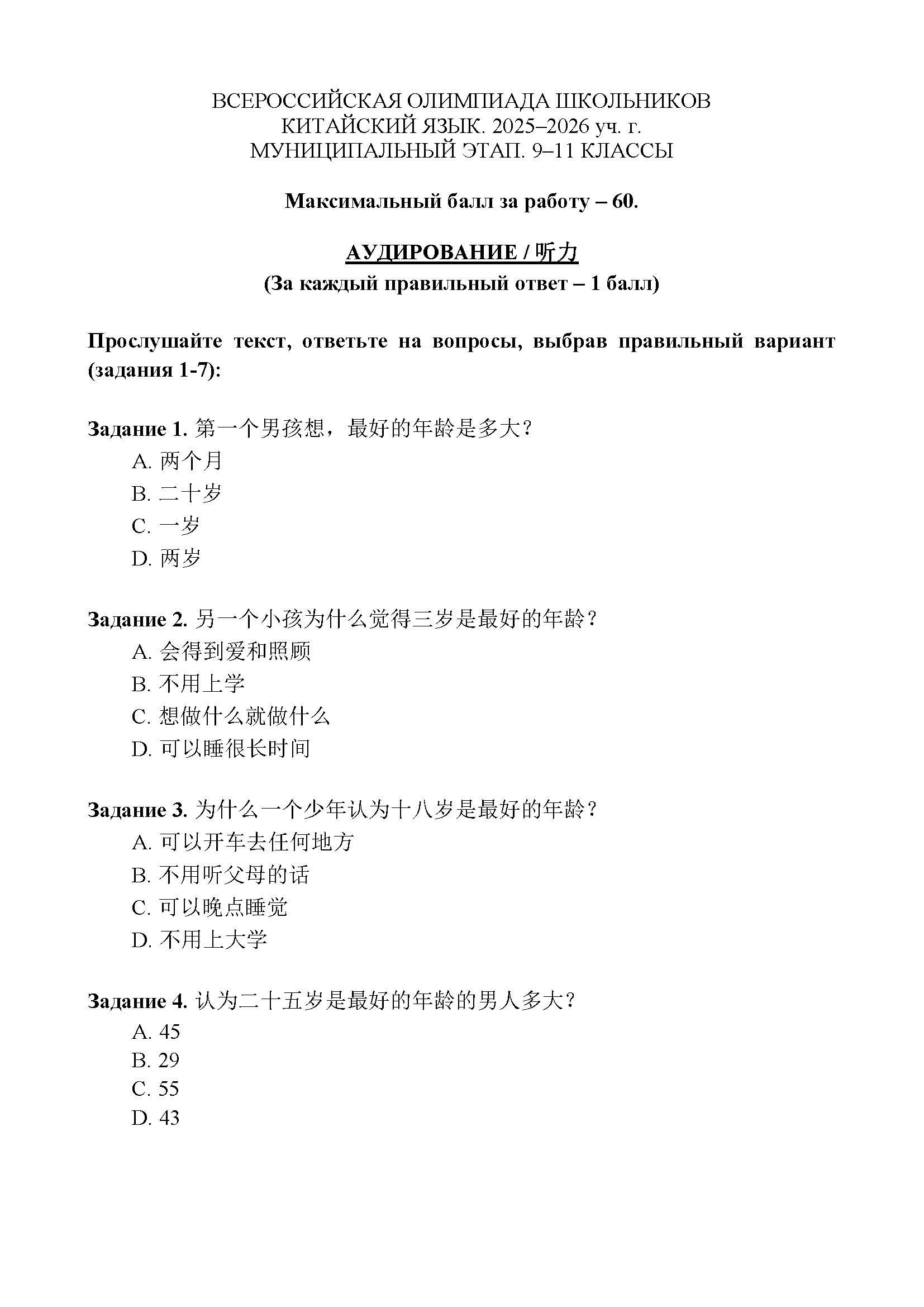 Всероссийская олимпиада школьников (ВсОШ) муниципального этапа по Китайскому языку. Официальные задания, ответы и решения для 9 (девятого) класса (задания и ответы)