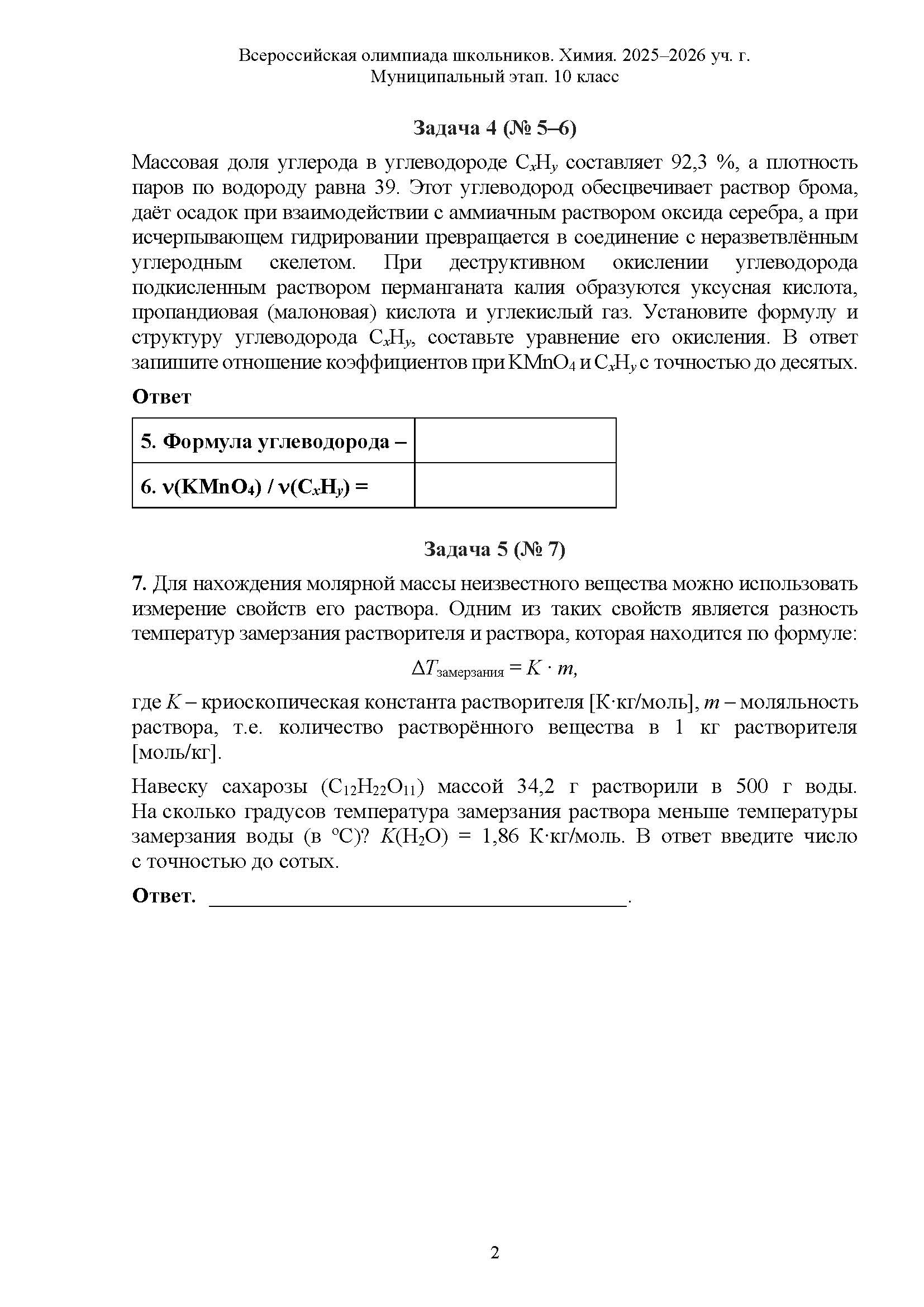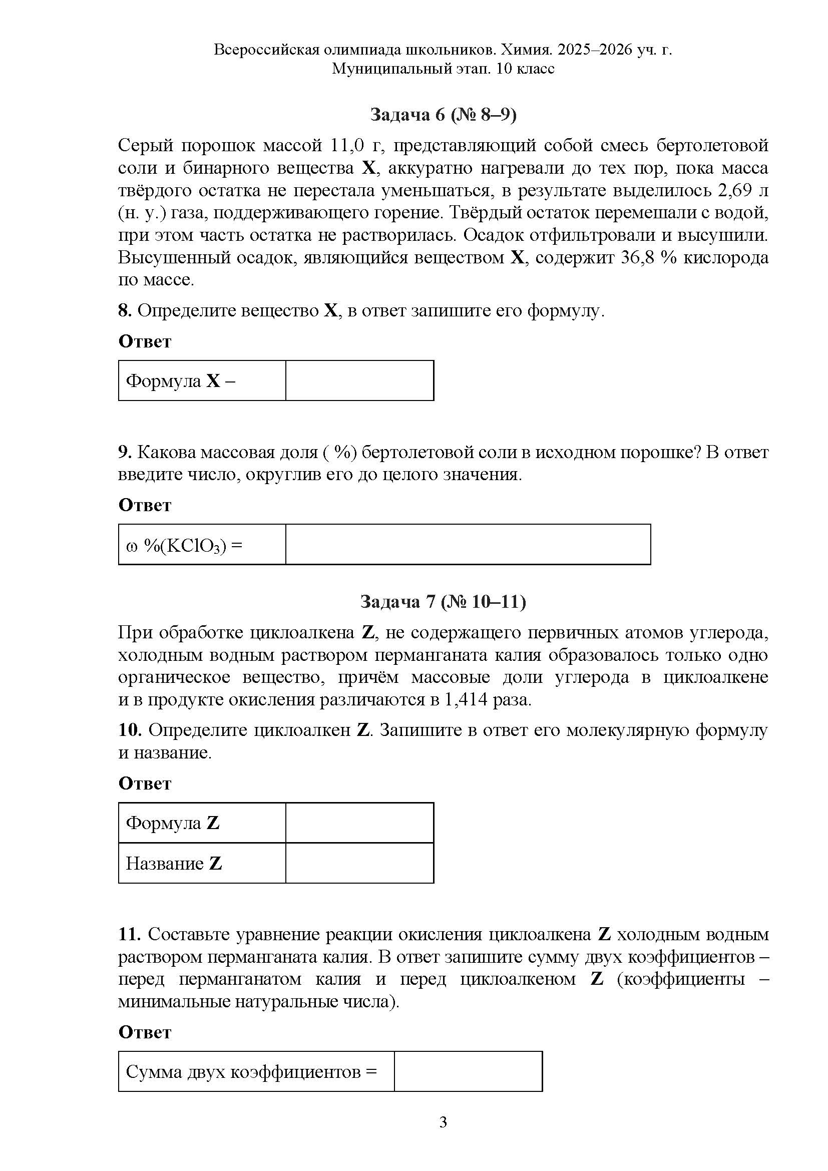 Всероссийская олимпиада школьников (ВсОШ) муниципального этапа по Химии. Официальные задания, ответы и решения для 10 (десятого) класса (задания и ответы)