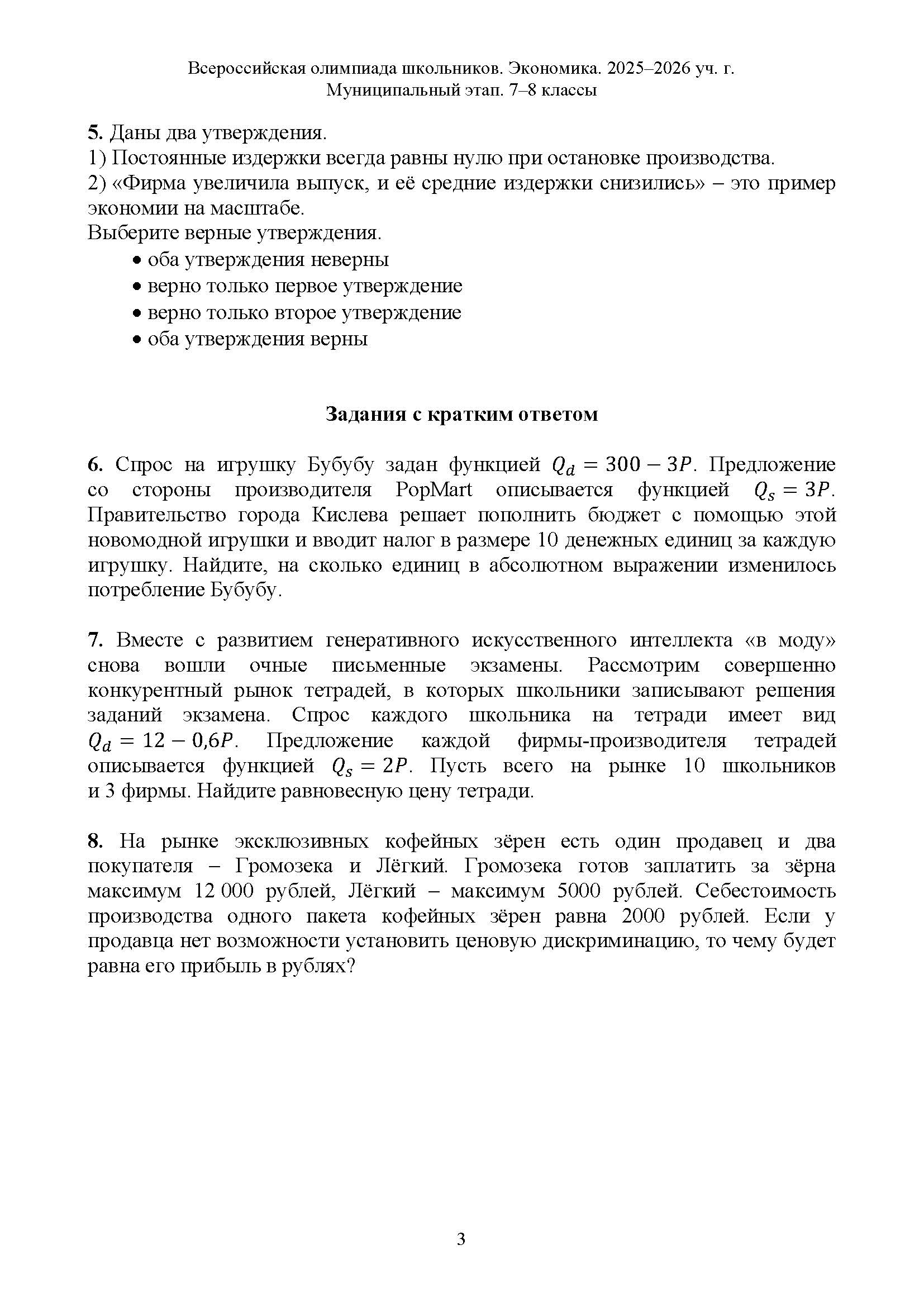 Всероссийская олимпиада школьников (ВсОШ) муниципального этапа по Экономике. Официальные задания, ответы и решения для 8 (восьмого) класса (задания и ответы)