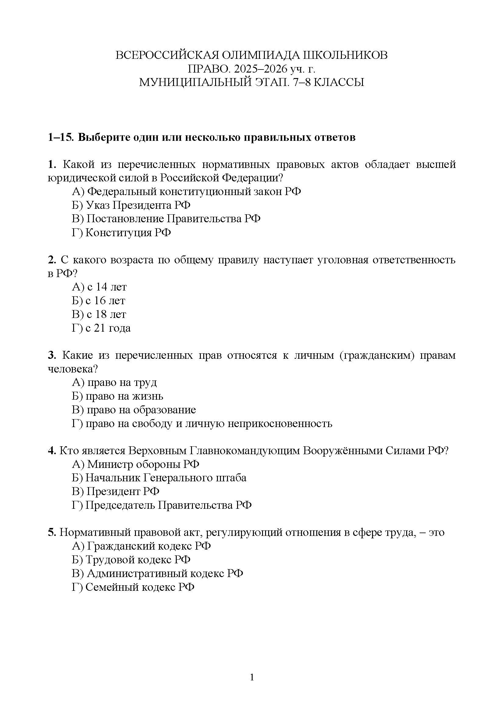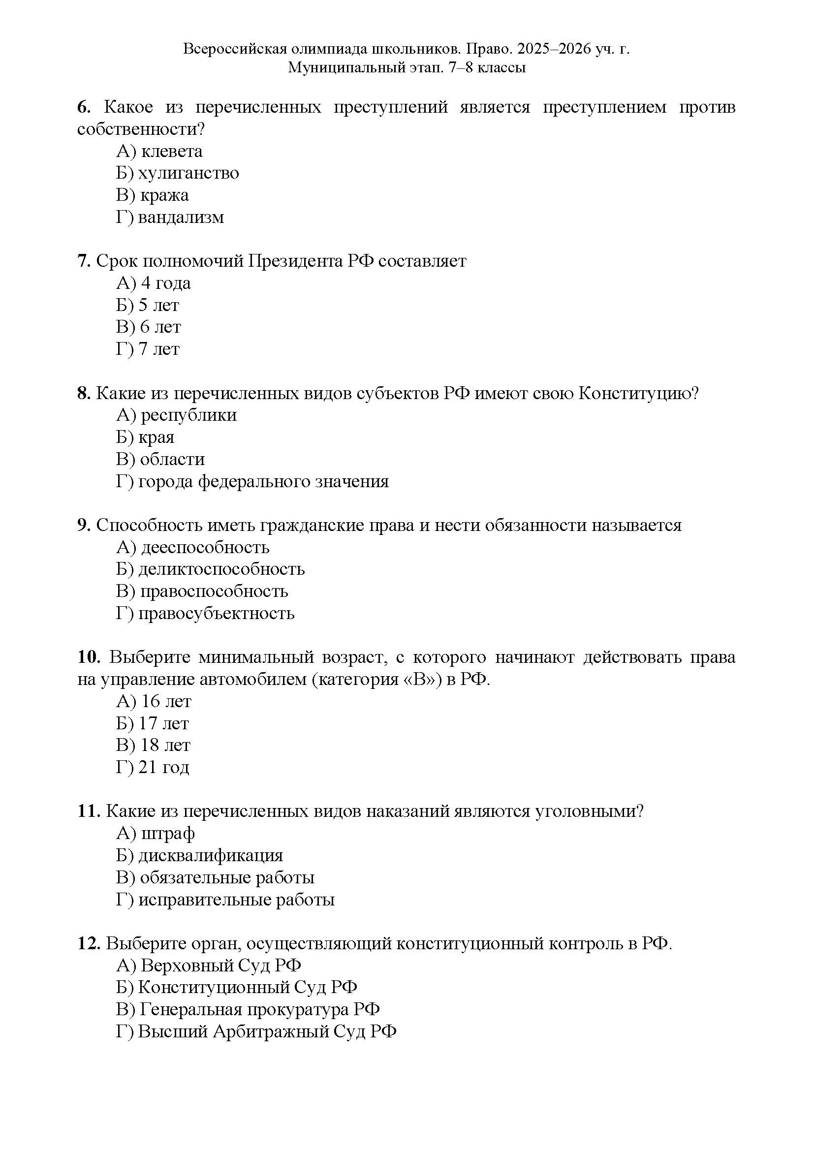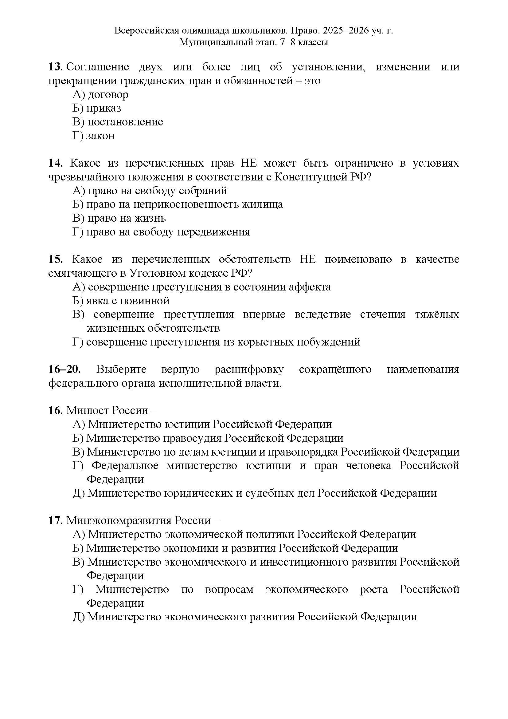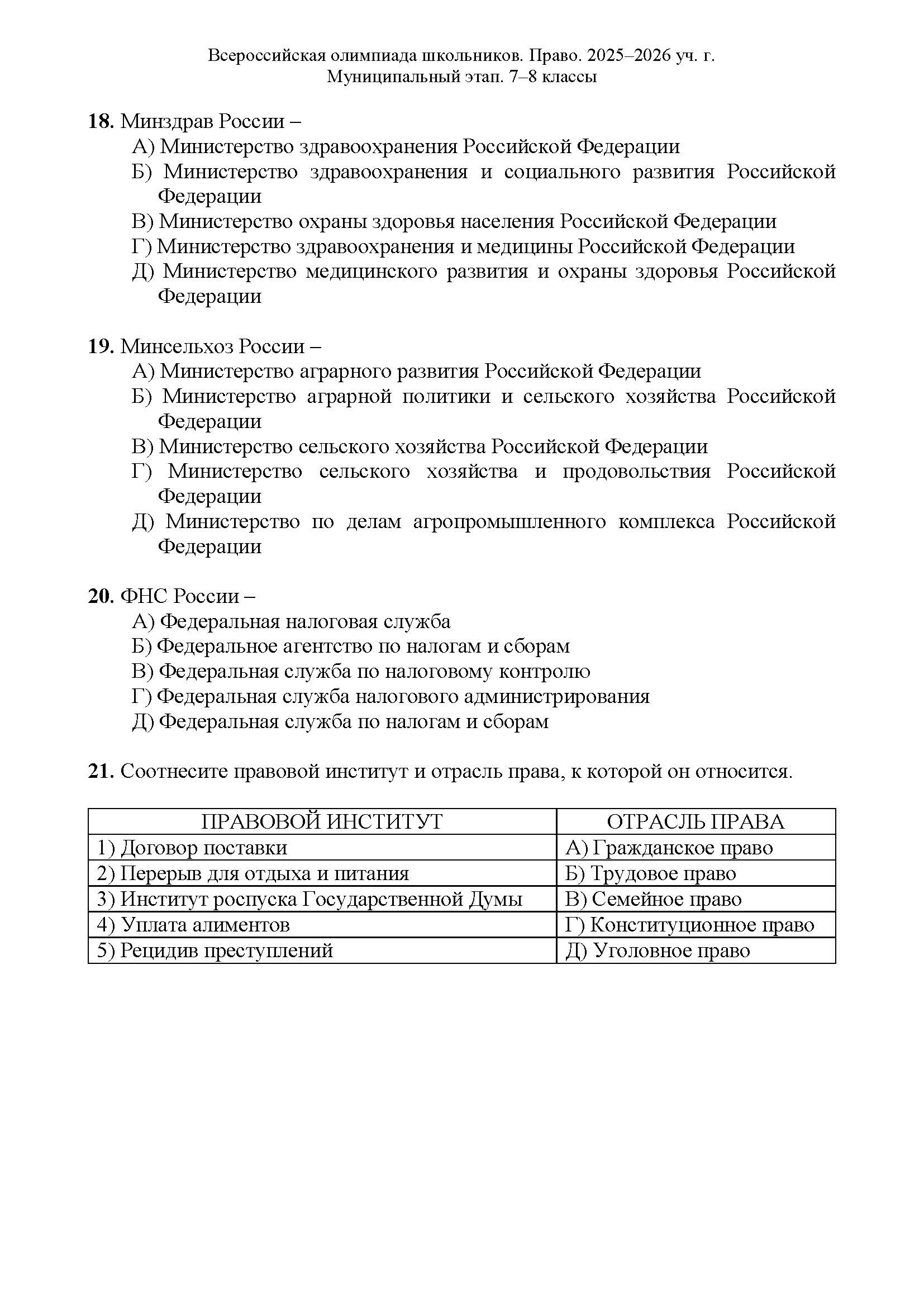 Всероссийская олимпиада школьников (ВсОШ) муниципального этапа по Праву. Официальные задания, ответы и решения для 7 (седьмого) класса (задания и ответы)