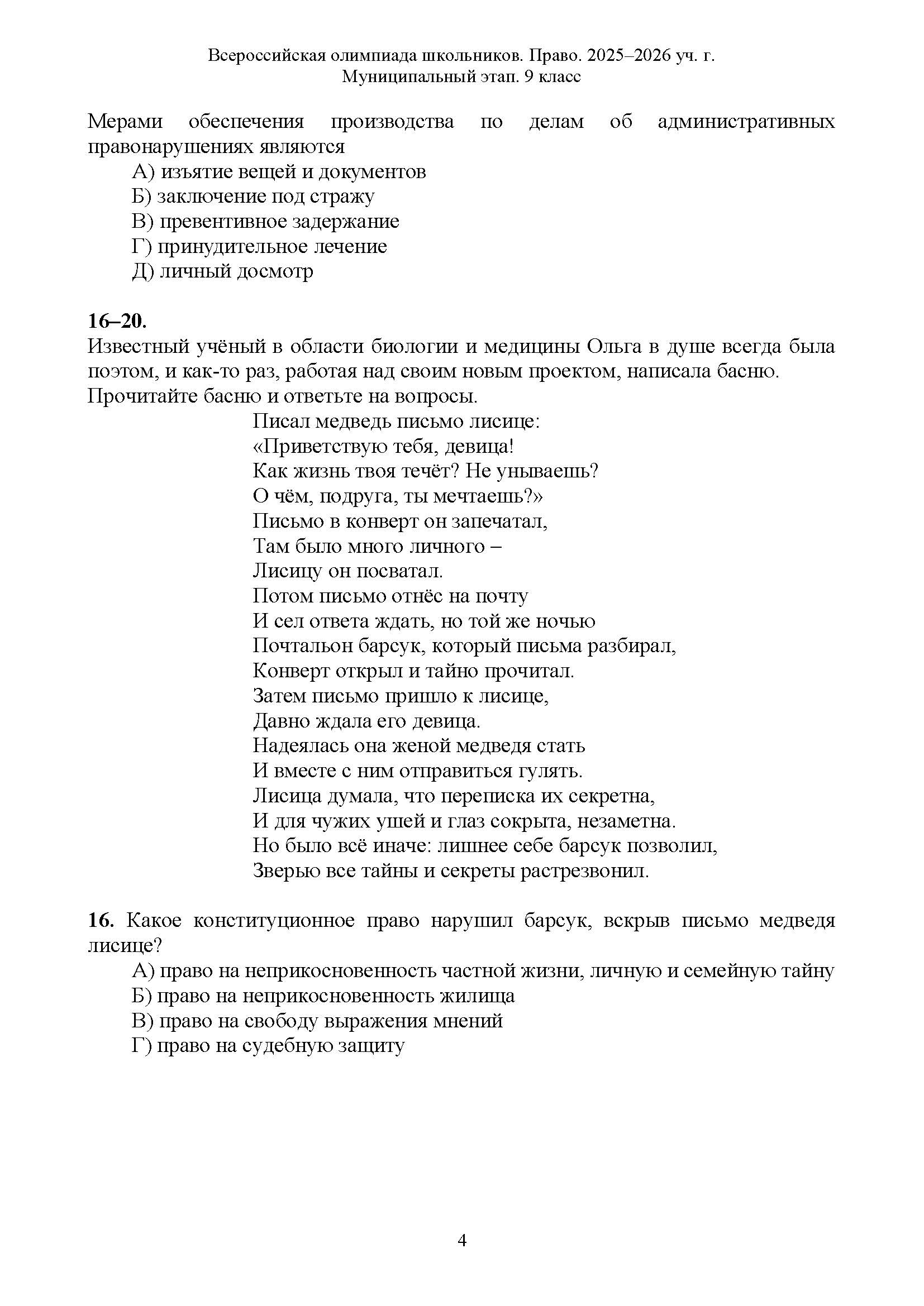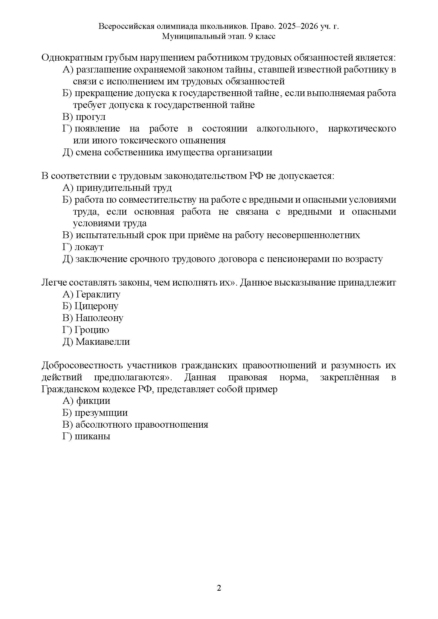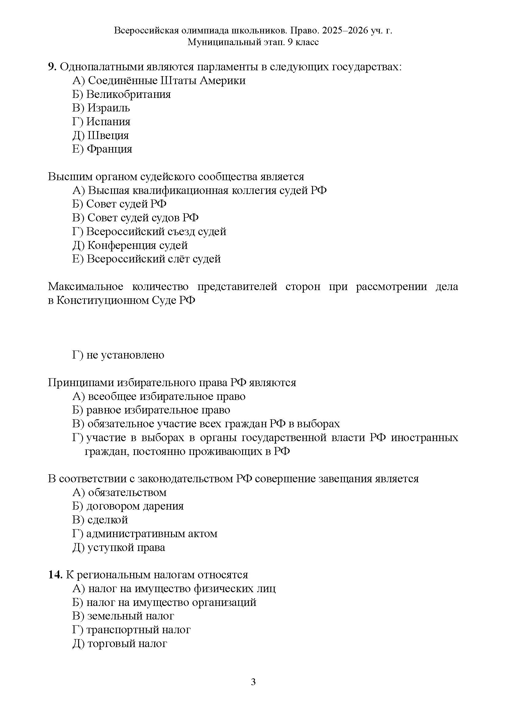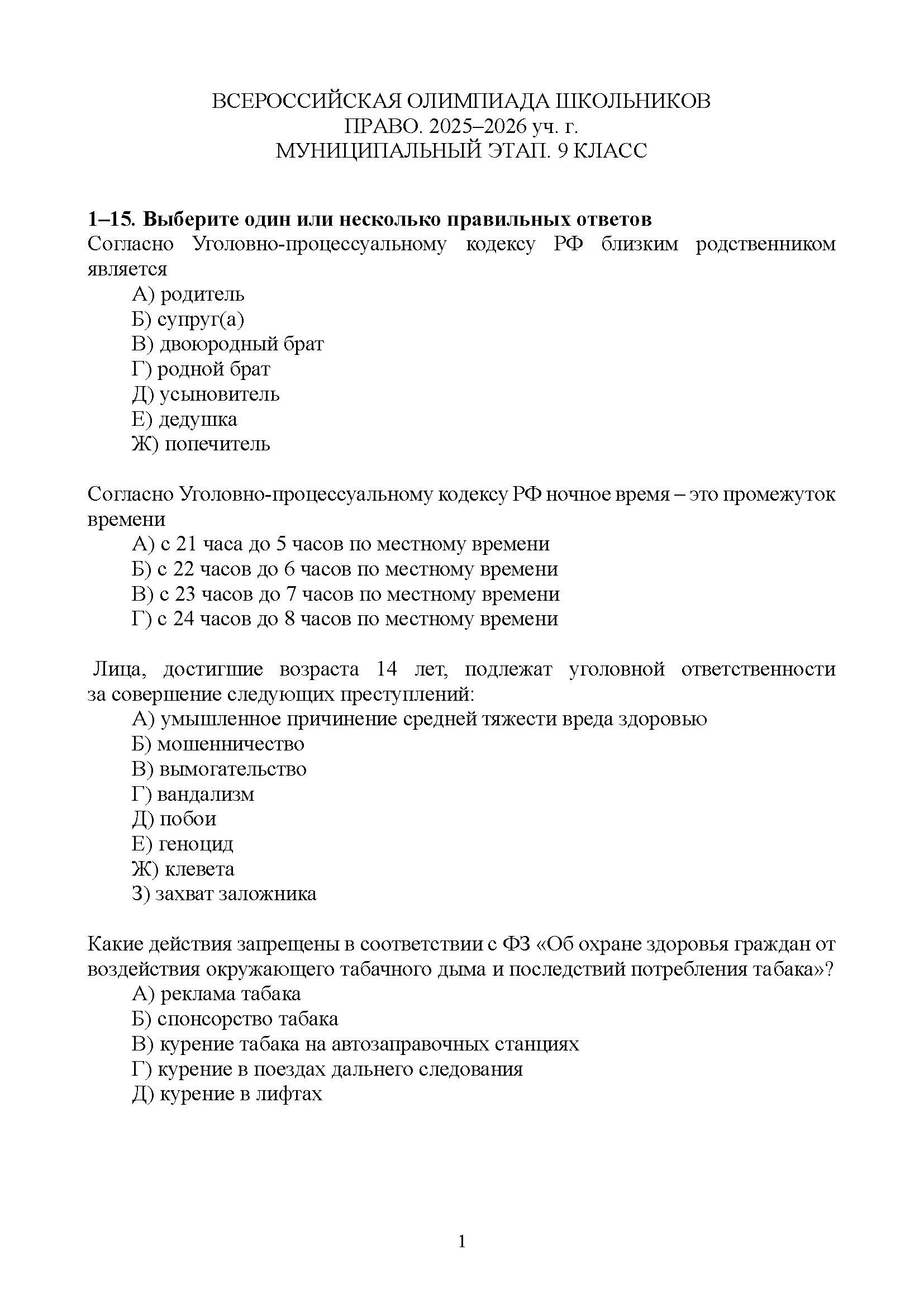 Всероссийская олимпиада школьников (ВсОШ) муниципального этапа по Праву. Официальные задания, ответы и решения для 9 (девятого) класса (задания и ответы)