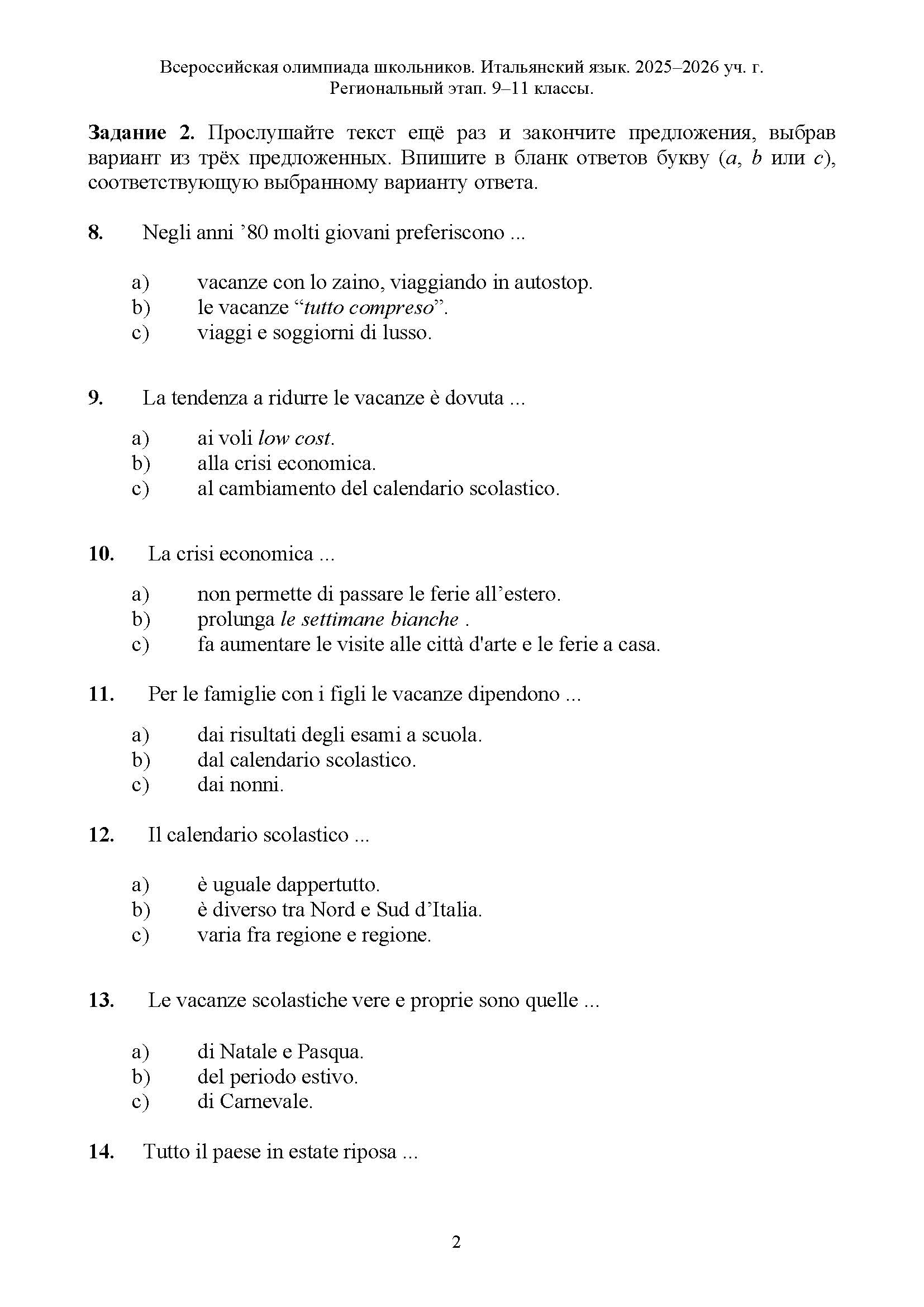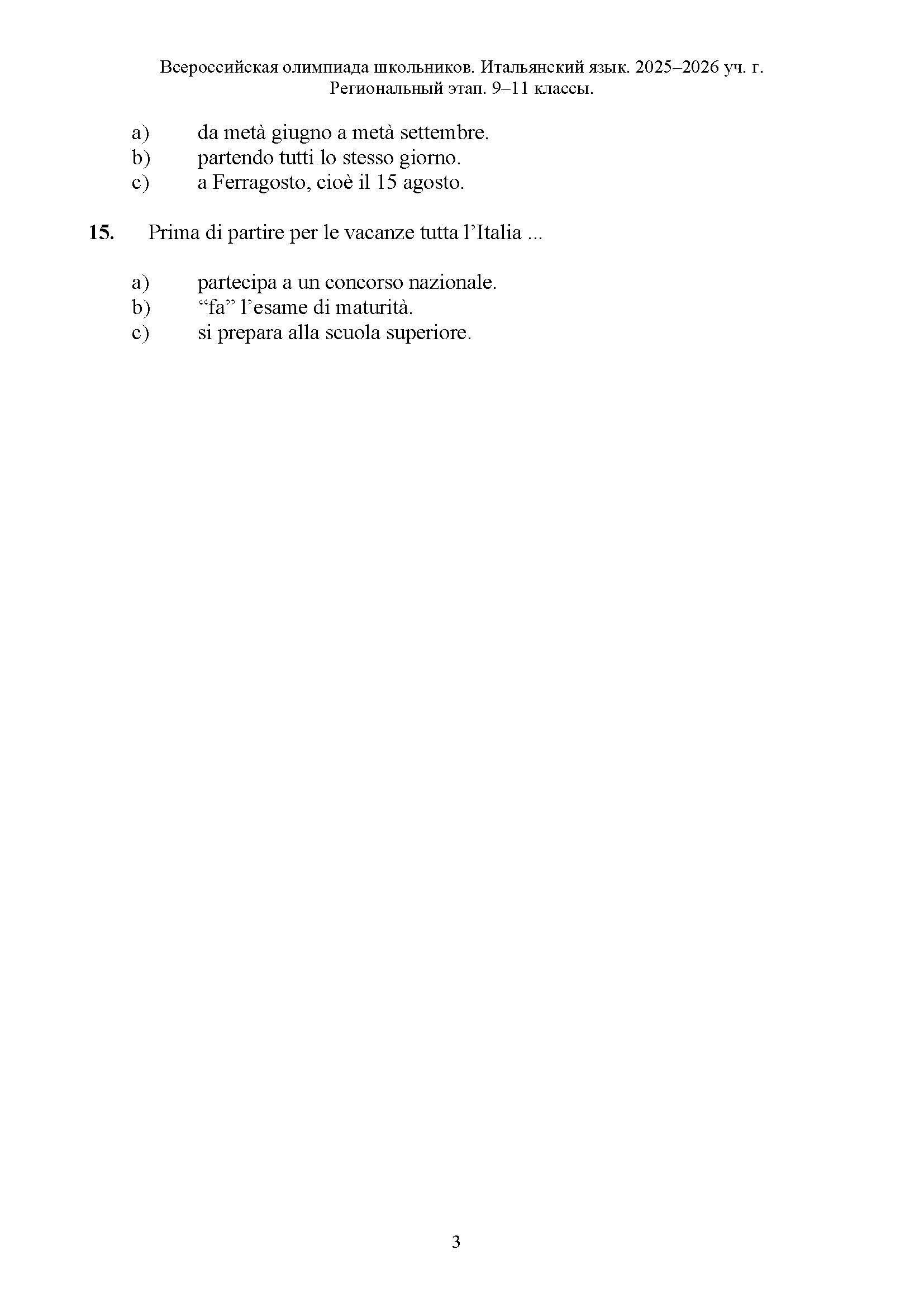Всероссийская олимпиада школьников (ВсОШ) регионального этапа по Итальянскому языку. Официальные задания, ответы и решения для 11 (одиннадцатого) класса (задания и ответы)