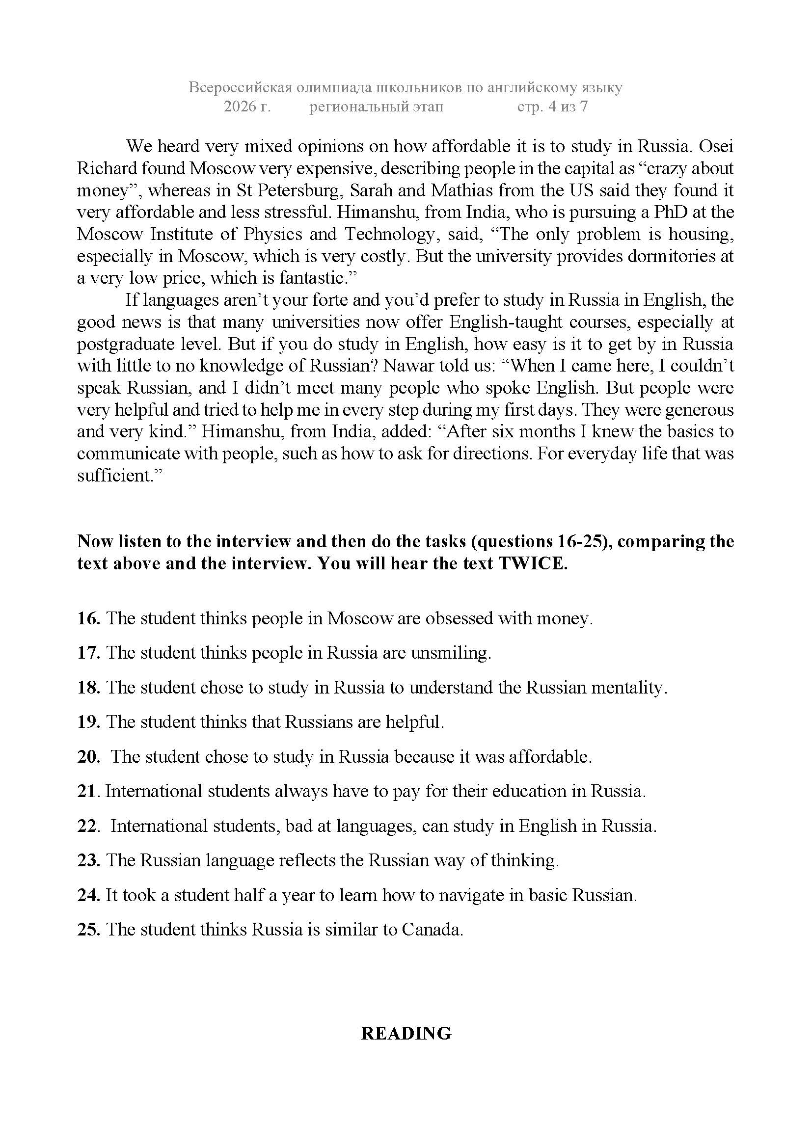 Всероссийская олимпиада школьников (ВсОШ) регионального этапа по Английскому языку. Официальные задания, ответы и решения для 11 (одиннадцатого) класса (задания и ответы)