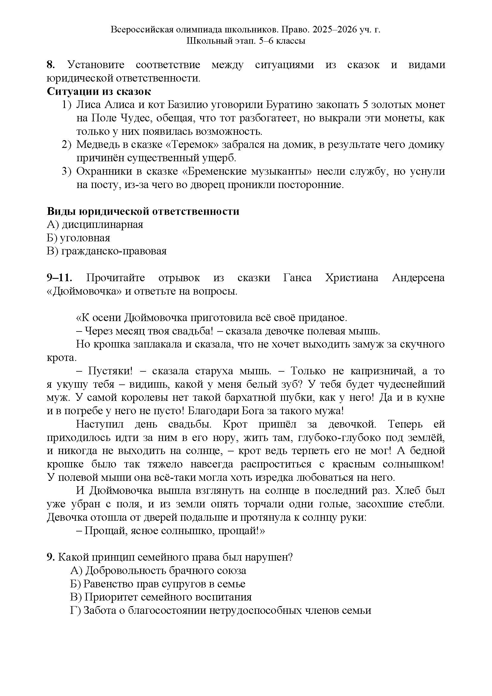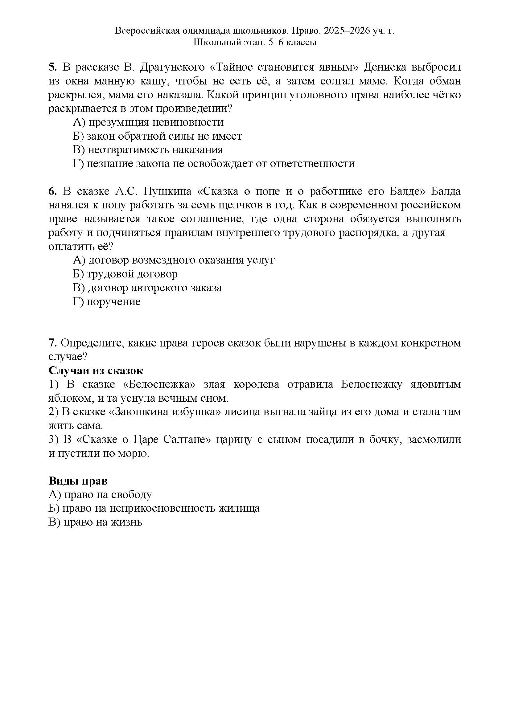 Всероссийская олимпиада школьников (ВсОШ) школьного этапа по Праву. Официальные задания, ответы и решения для 5 (пятого) класса (задания и ответы)