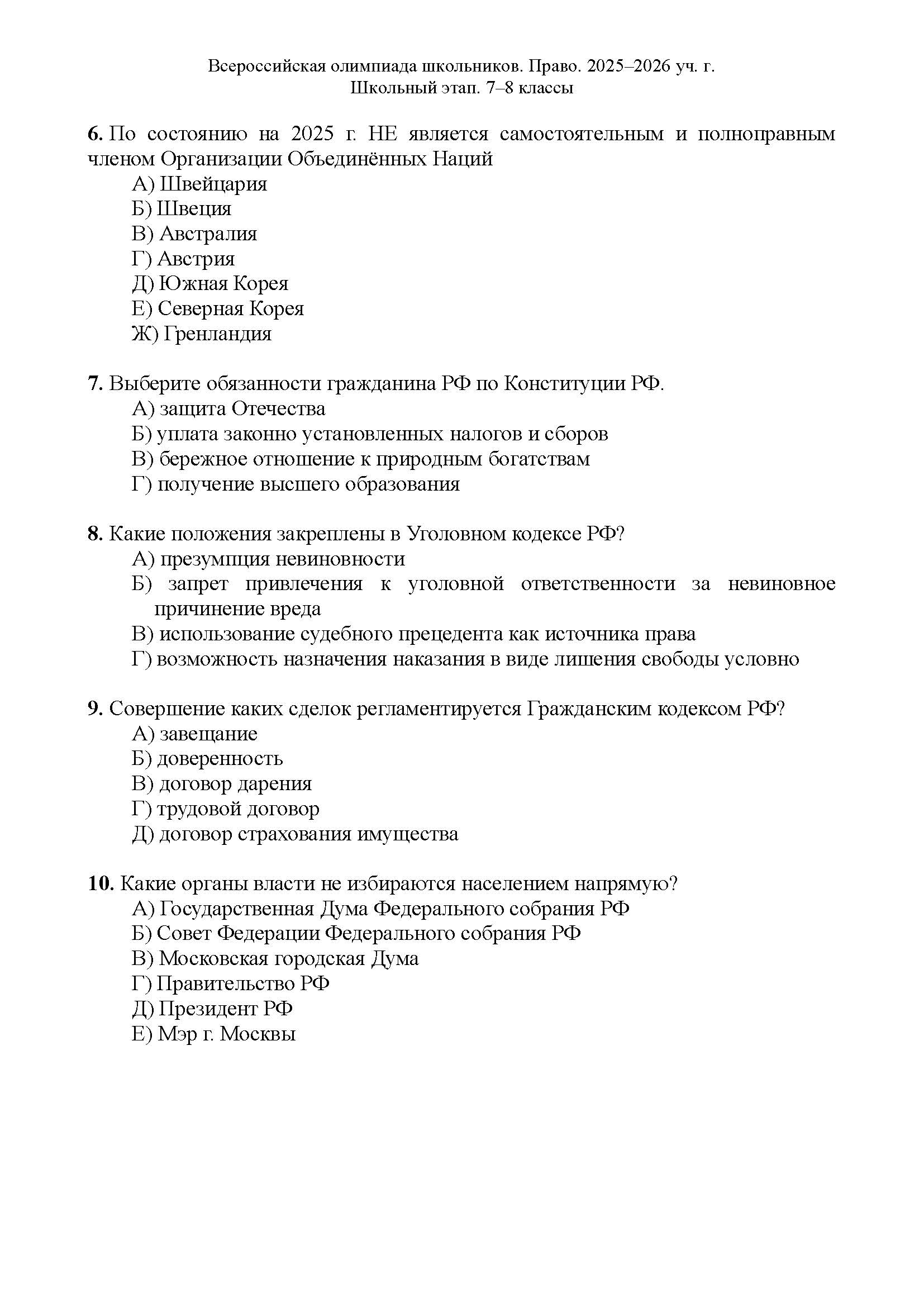 Всероссийская олимпиада школьников (ВсОШ) школьного этапа по Праву. Официальные задания, ответы и решения для 7 (седьмого) класса (задания и ответы)