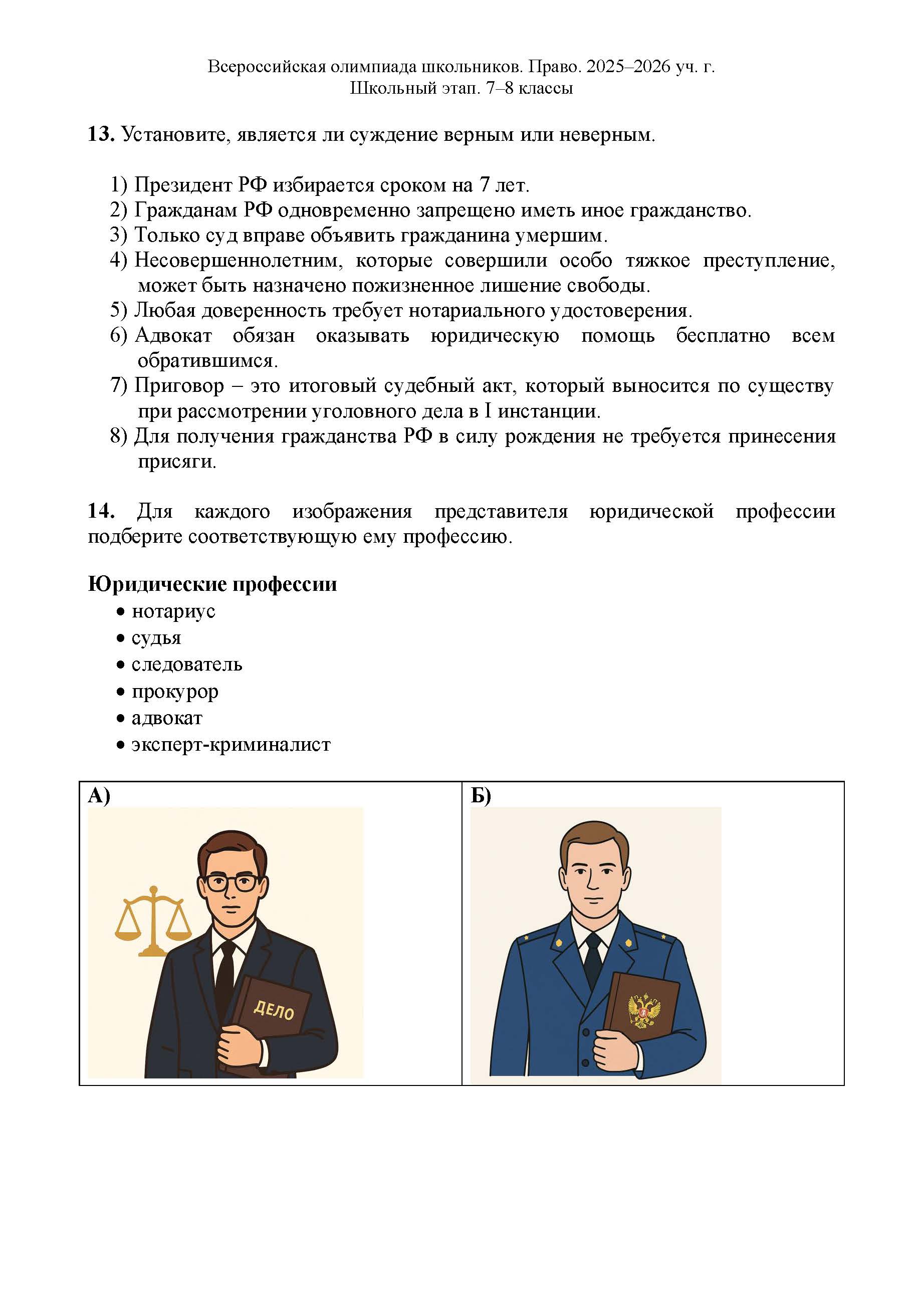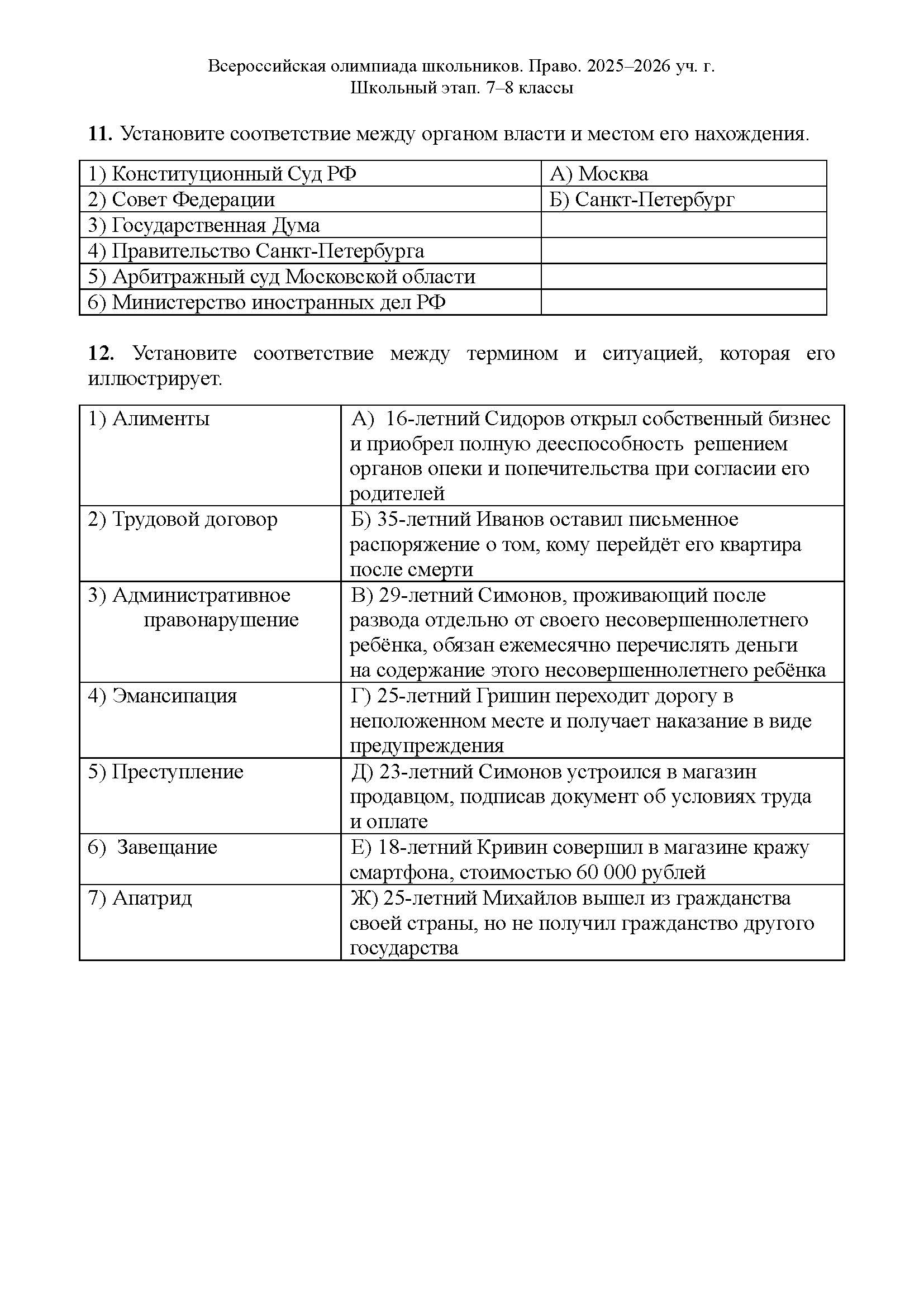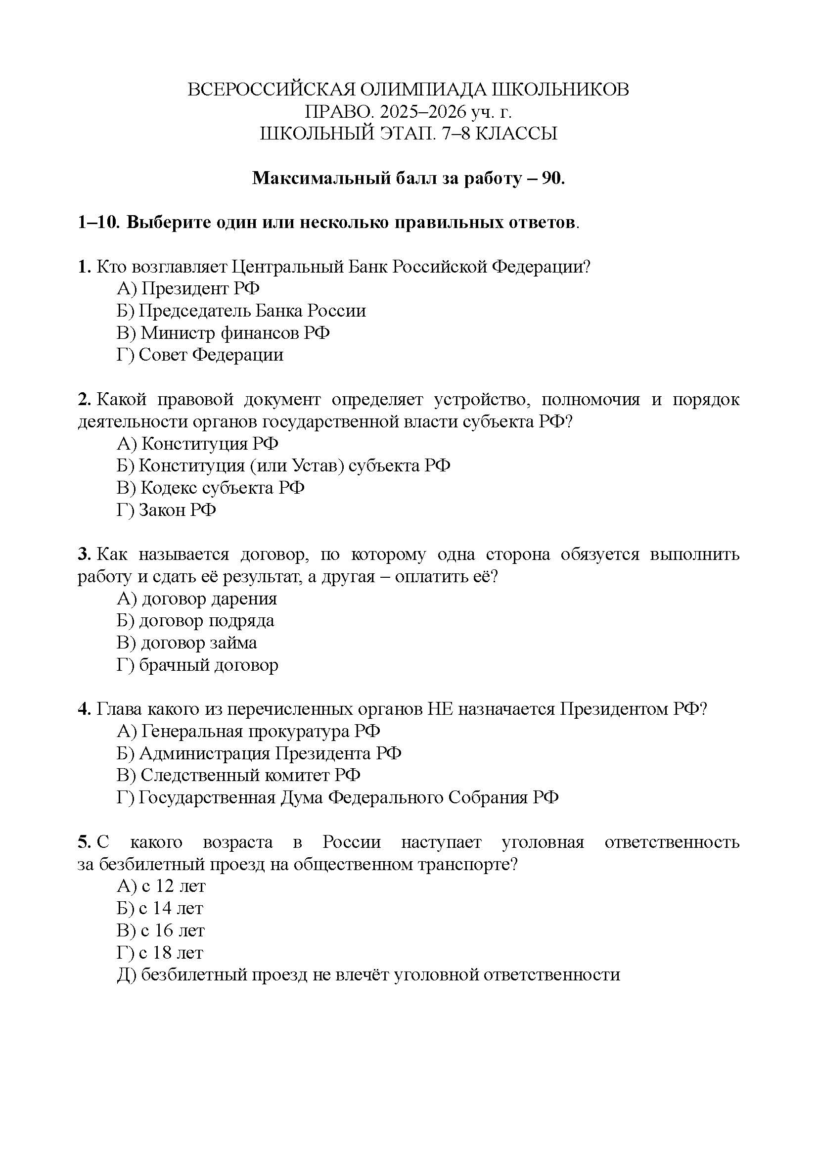 Всероссийская олимпиада школьников (ВсОШ) школьного этапа по Праву. Официальные задания, ответы и решения для 8 (восьмого) класса (задания и ответы)