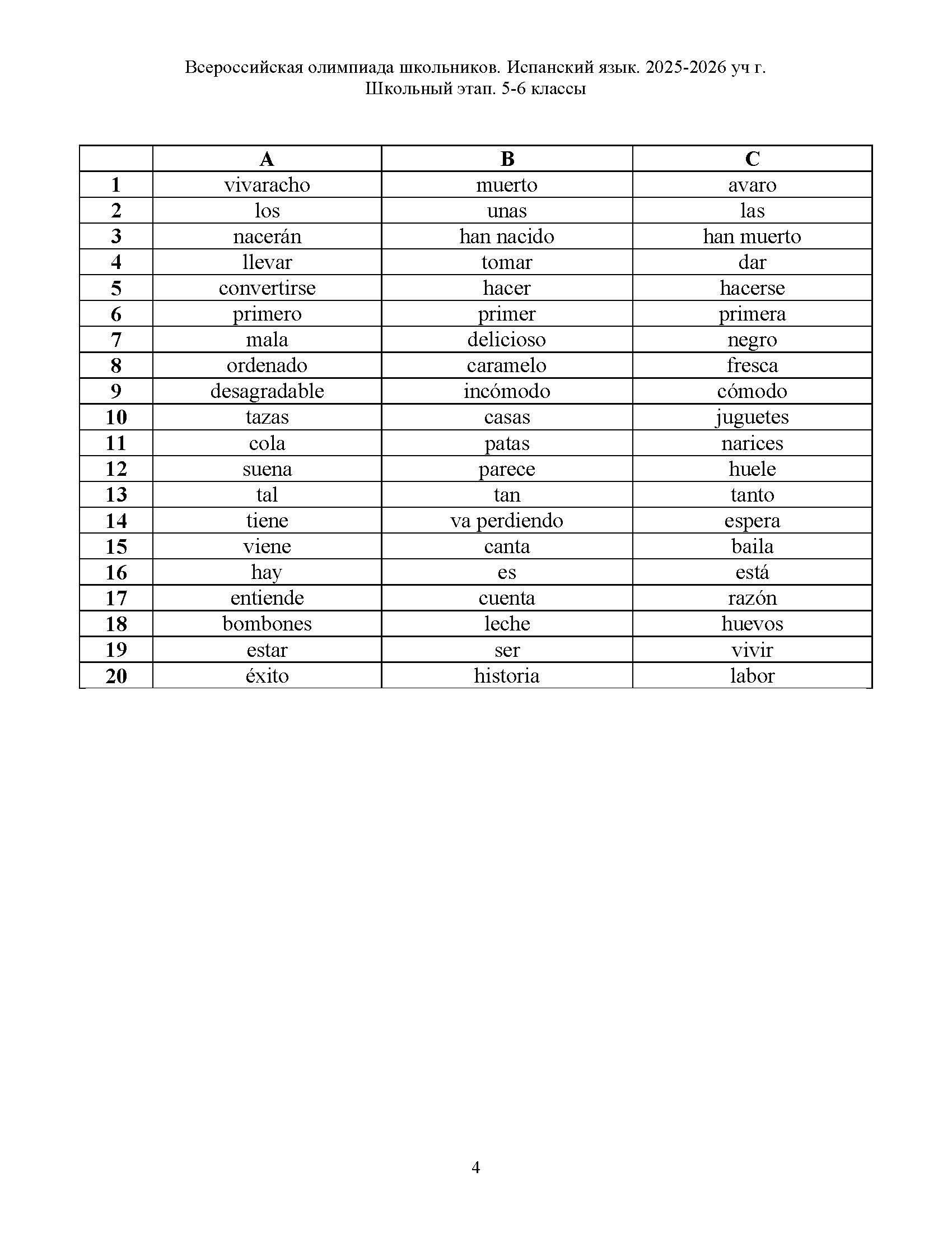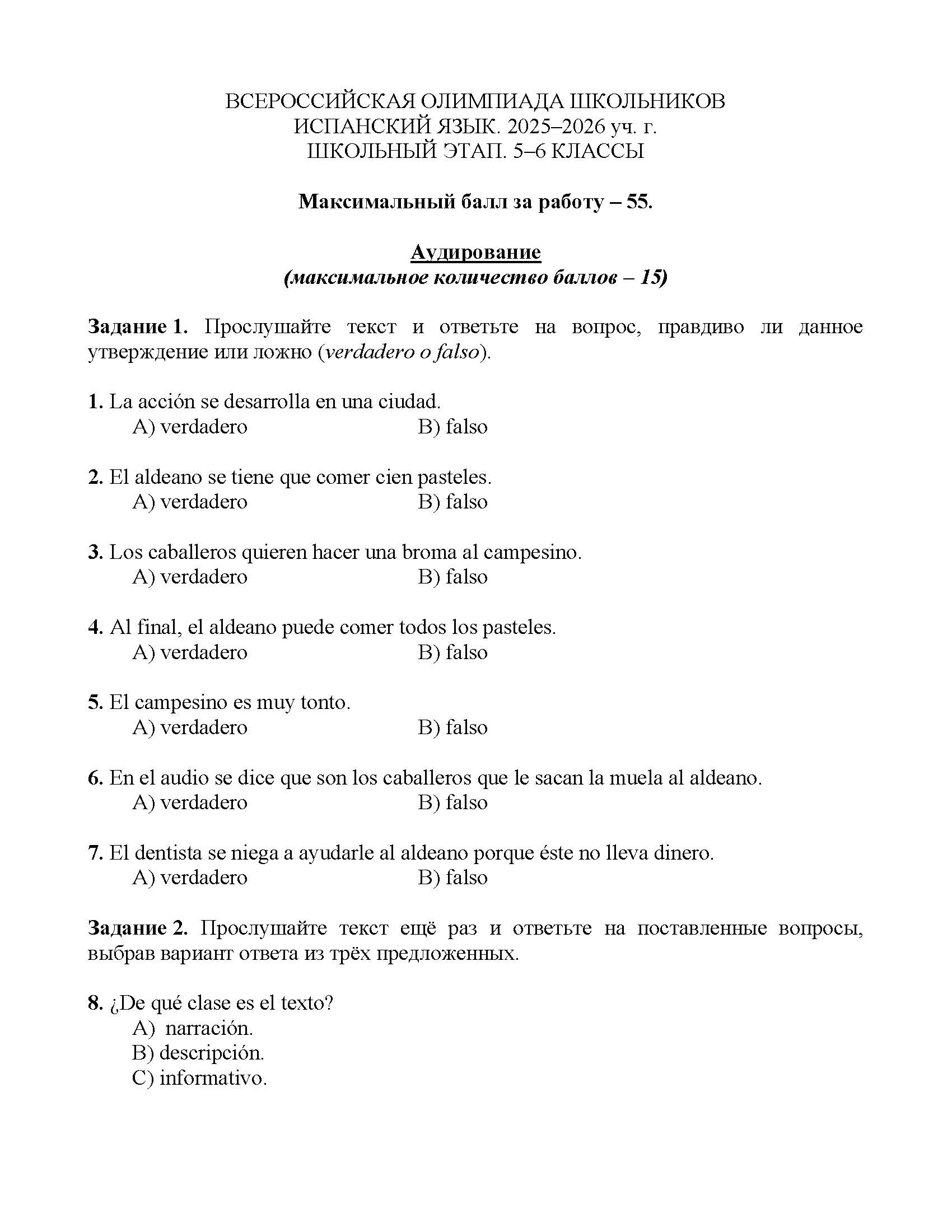 Всероссийская олимпиада школьников (ВсОШ) школьного этапа по Испанскому языку. Официальные задания, ответы и решения для 6 (шестого) класса (задания и ответы)