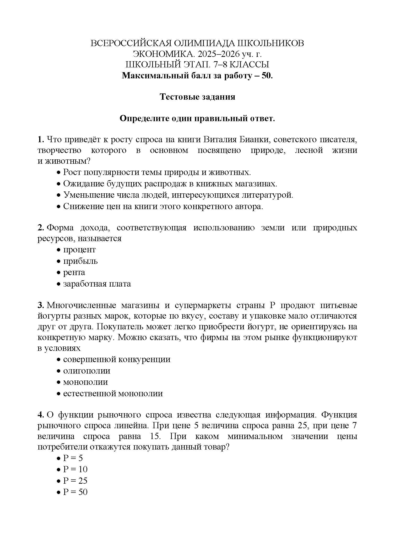 Всероссийская олимпиада школьников (ВсОШ) школьного этапа по Экономике. Официальные задания, ответы и решения для 8 (восьмого) класса (задания и ответы)
