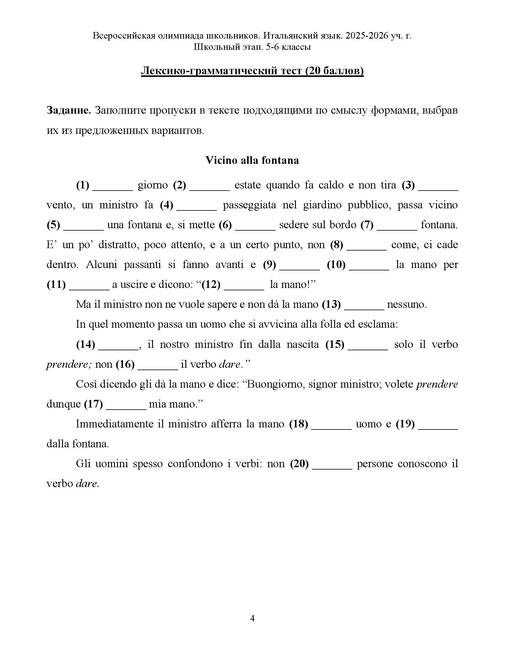 Всероссийская олимпиада школьников (ВсОШ) школьного этапа по Итальянскому языку. Официальные задания, ответы и решения для 5 (пятого) класса (задания и ответы)