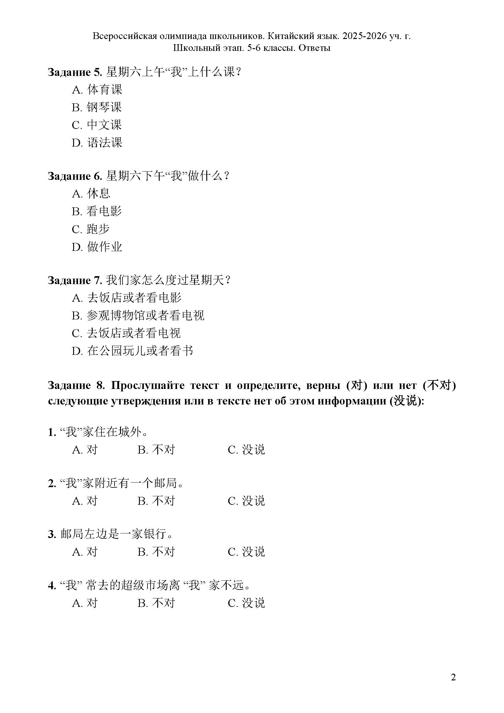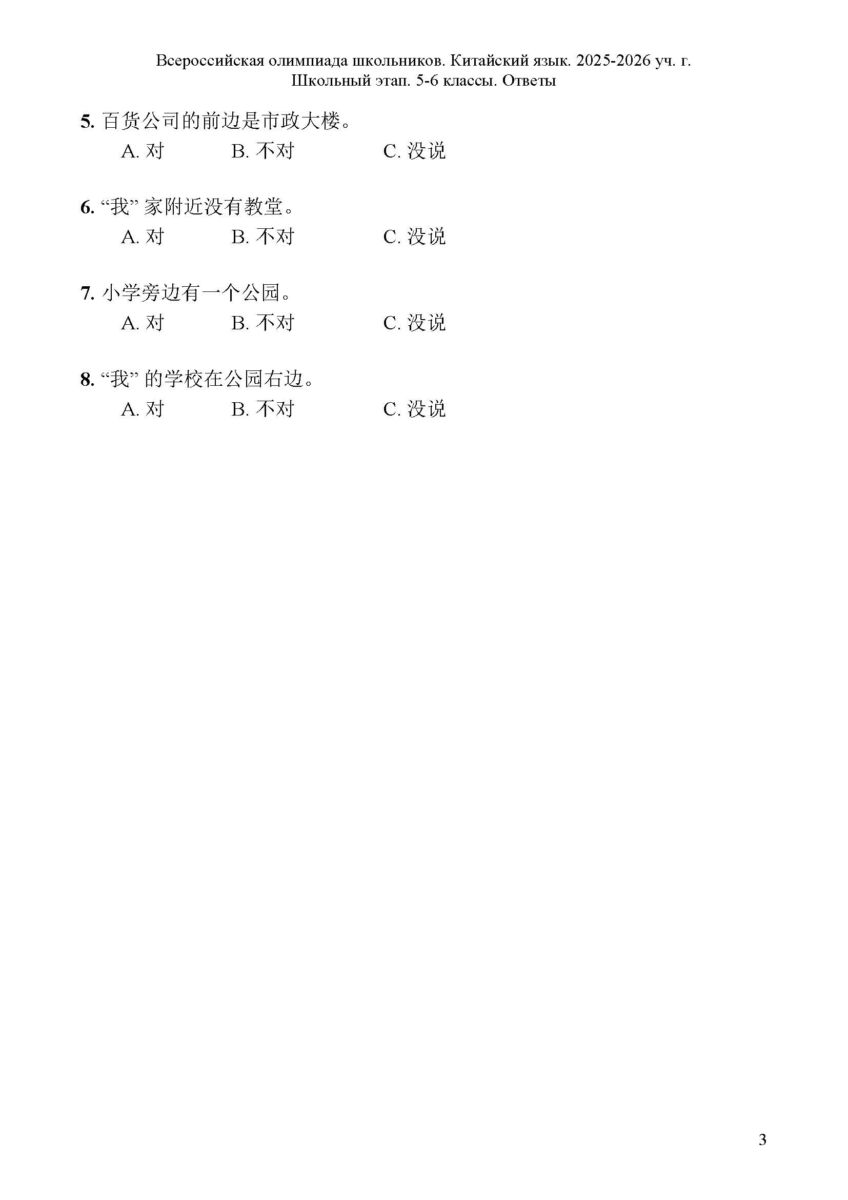 Всероссийская олимпиада школьников (ВсОШ) школьного этапа по Китайскому языку. Официальные задания, ответы и решения для 5 (пятого) класса (задания и ответы)