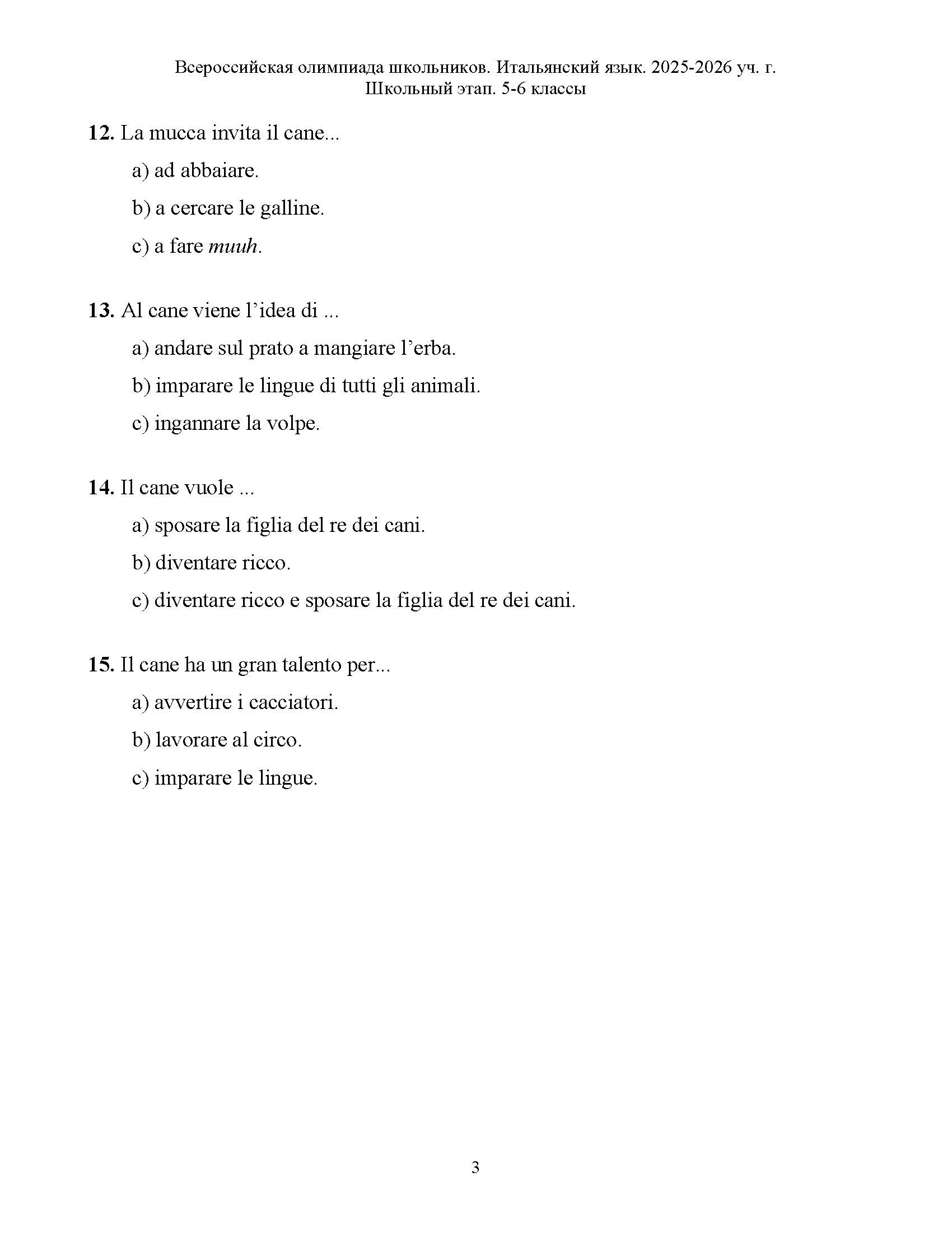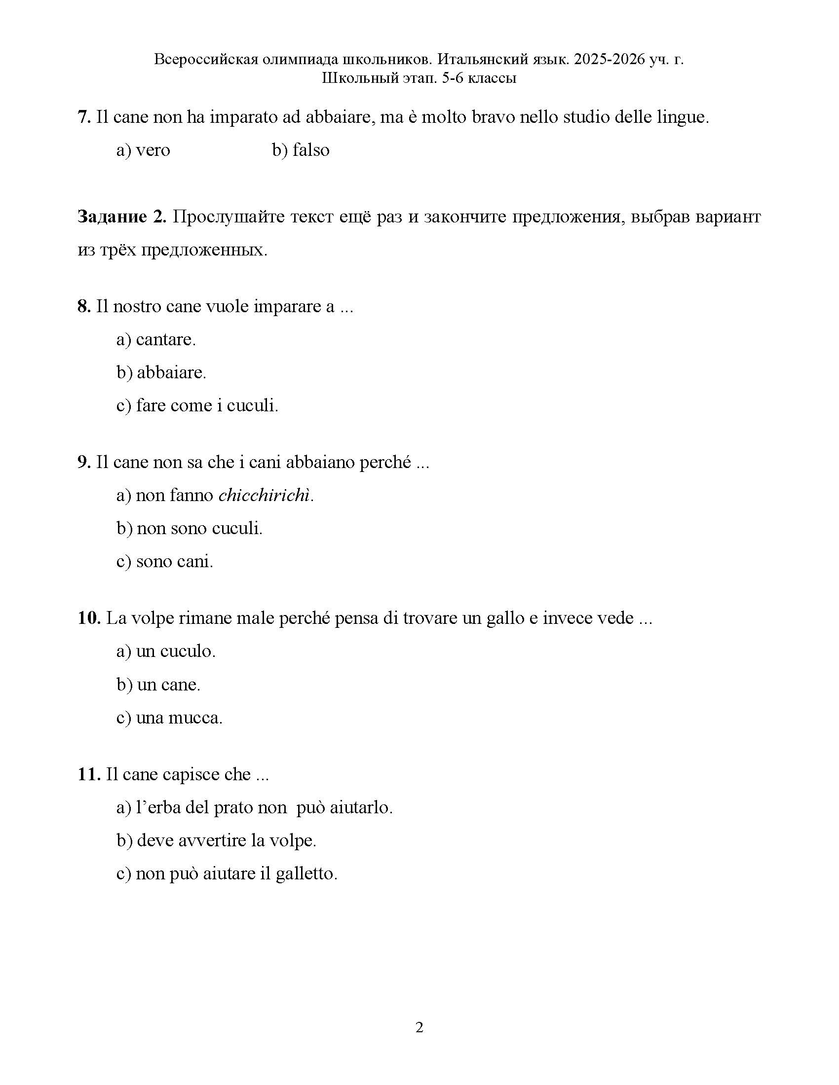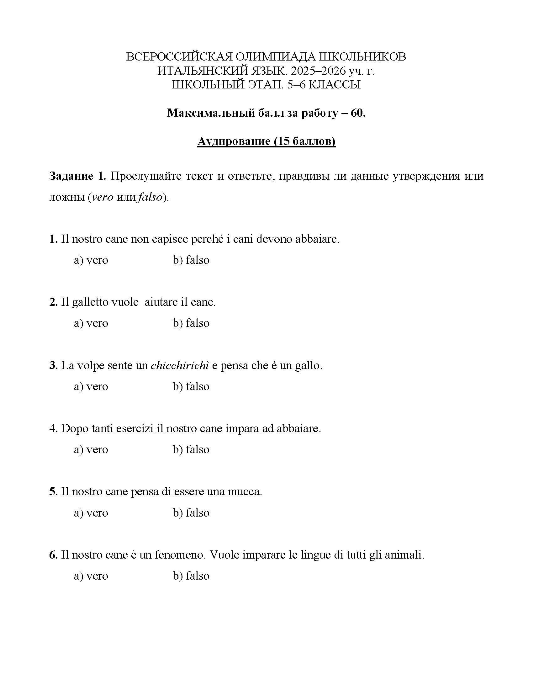 Всероссийская олимпиада школьников (ВсОШ) школьного этапа по Итальянскому языку. Официальные задания, ответы и решения для 6 (шестого) класса (задания и ответы)