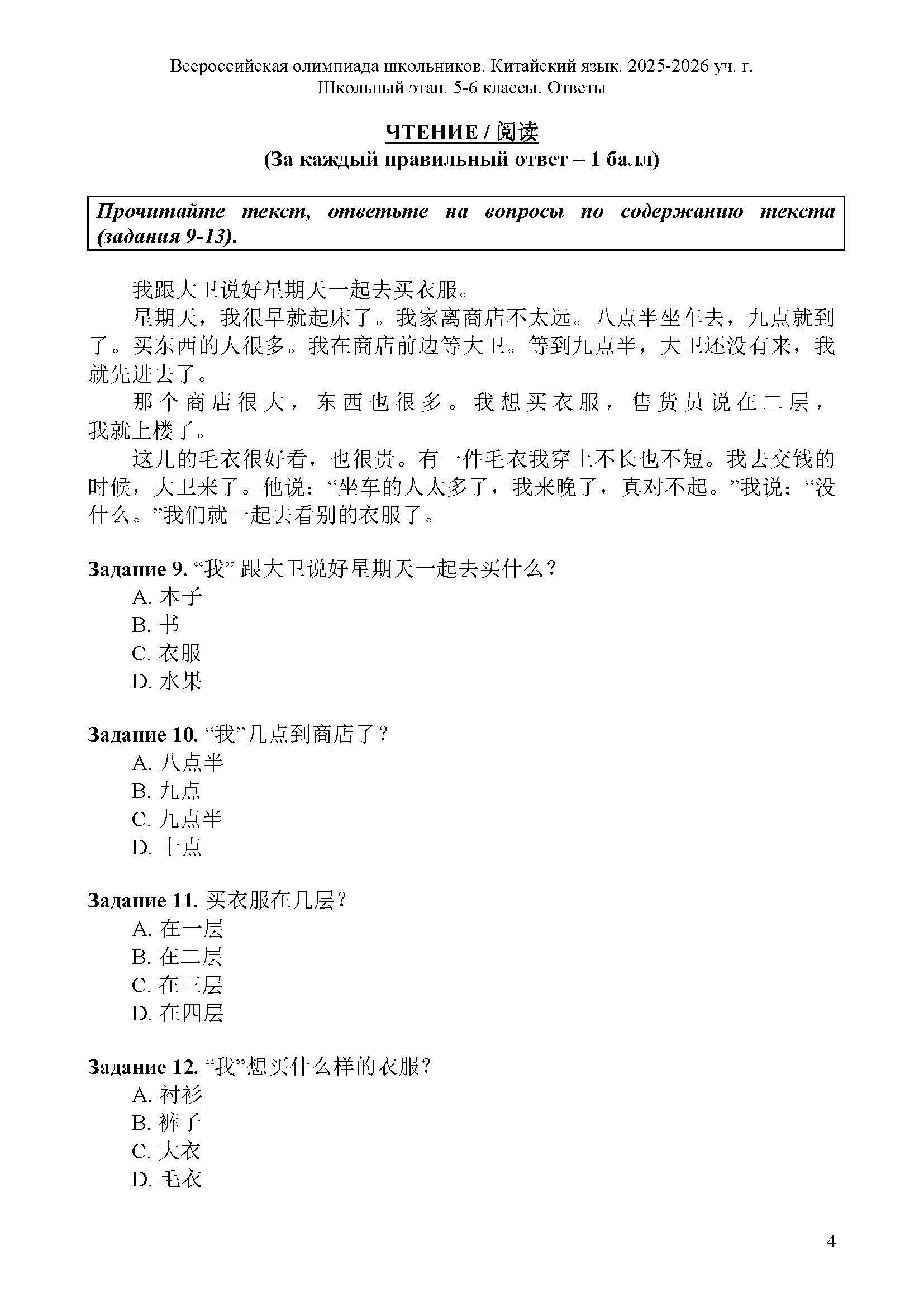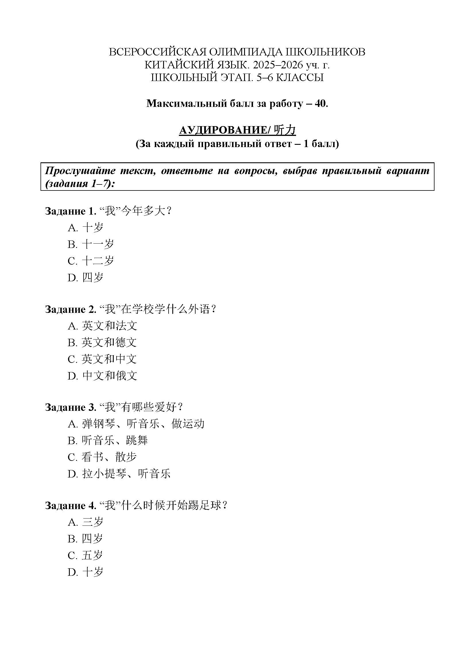 Всероссийская олимпиада школьников (ВсОШ) школьного этапа по Китайскому языку. Официальные задания, ответы и решения для 6 (шестого) класса (задания и ответы)