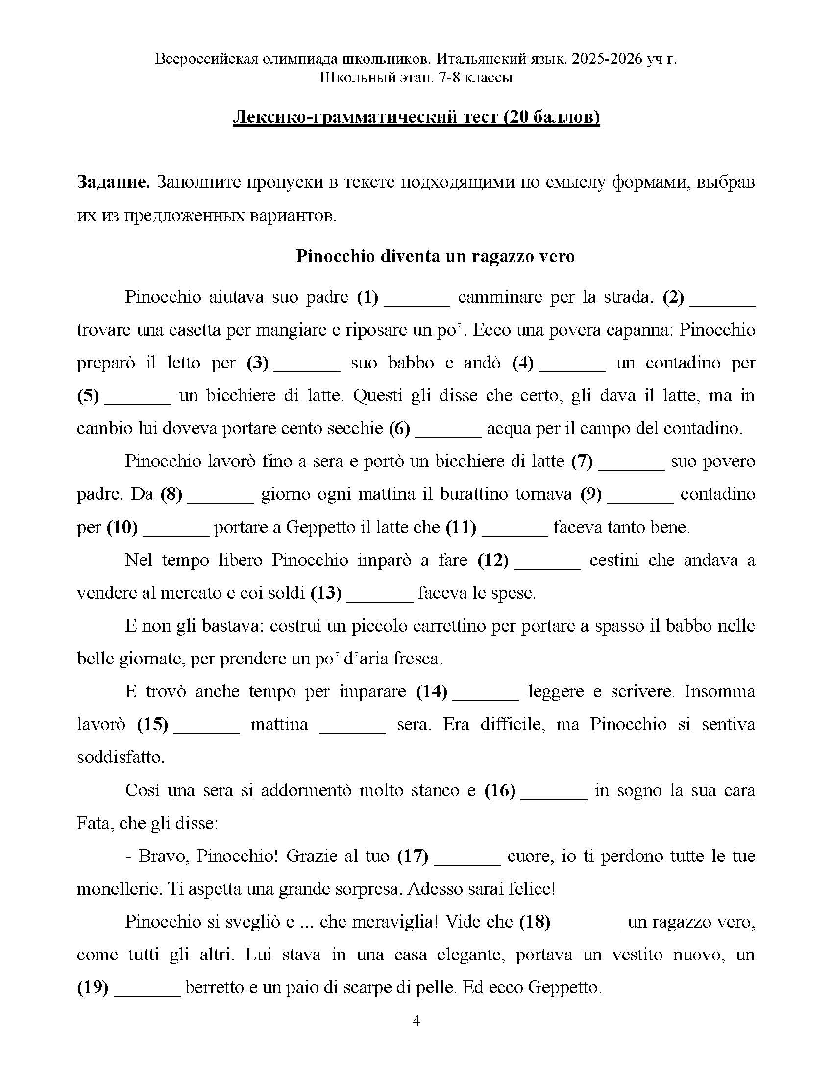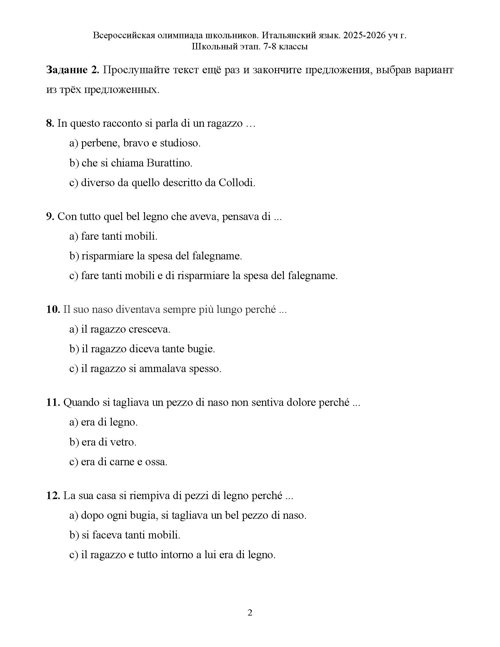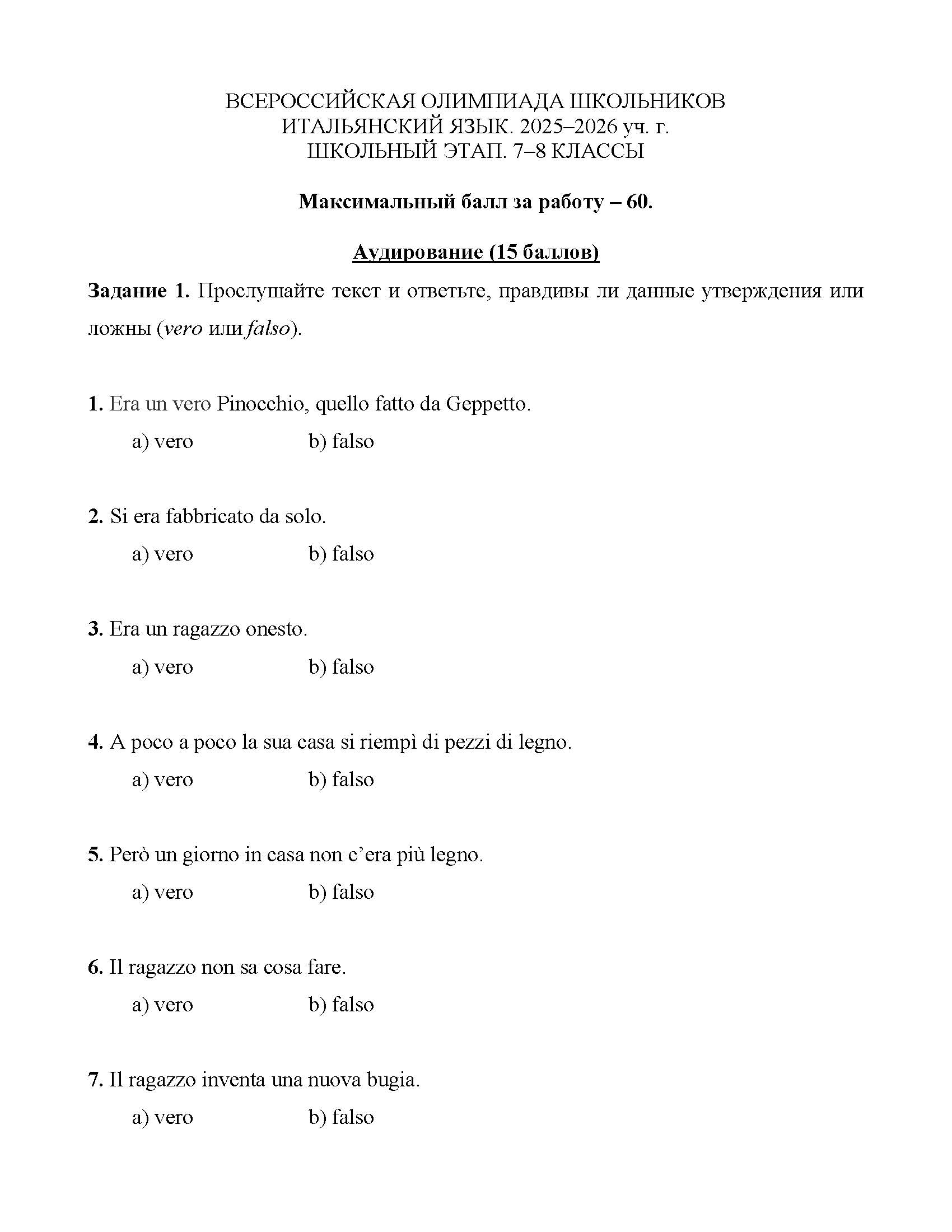 Всероссийская олимпиада школьников (ВсОШ) школьного этапа по Итальянскому языку. Официальные задания, ответы и решения для 7 (седьмого) класса (задания и ответы)