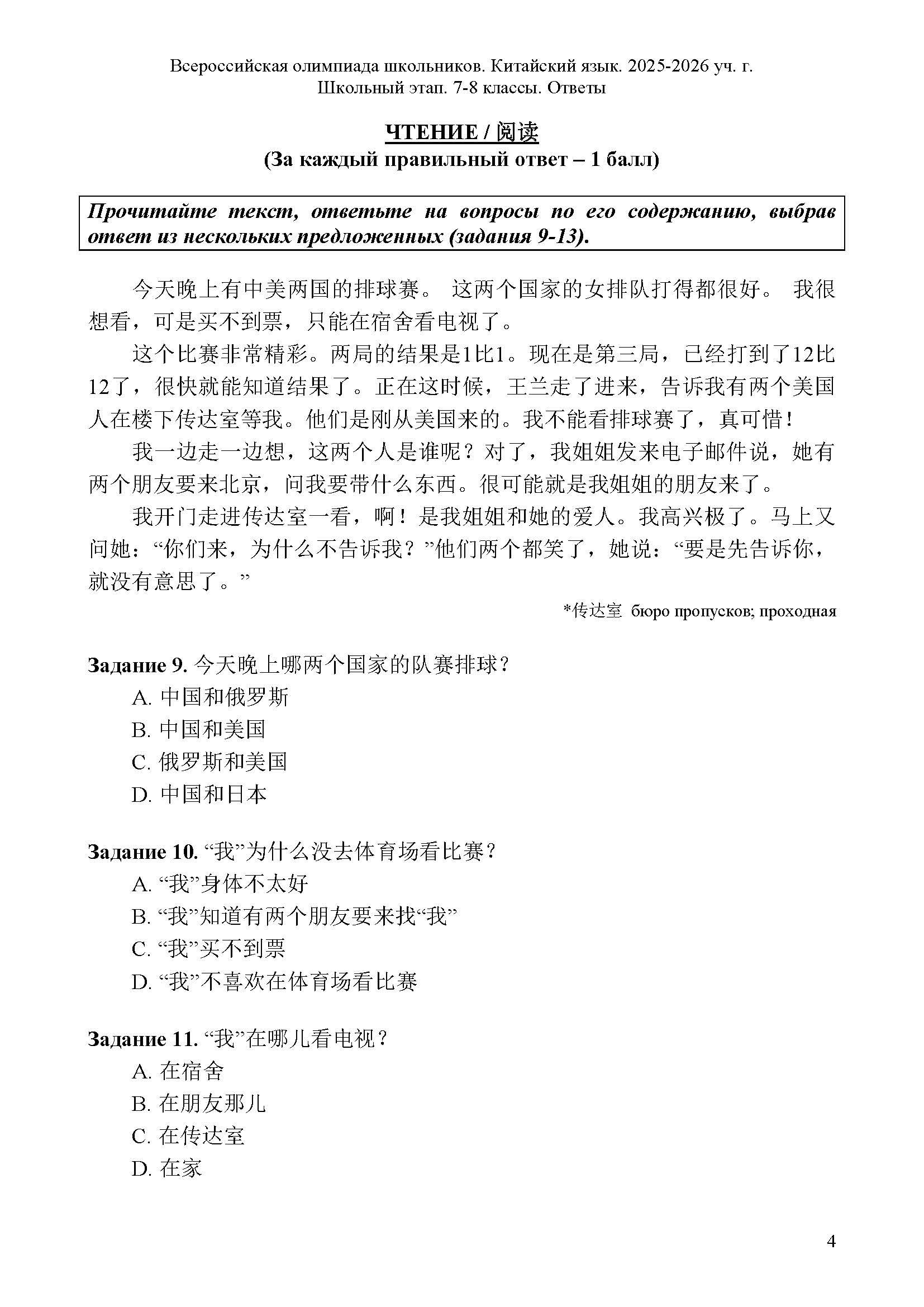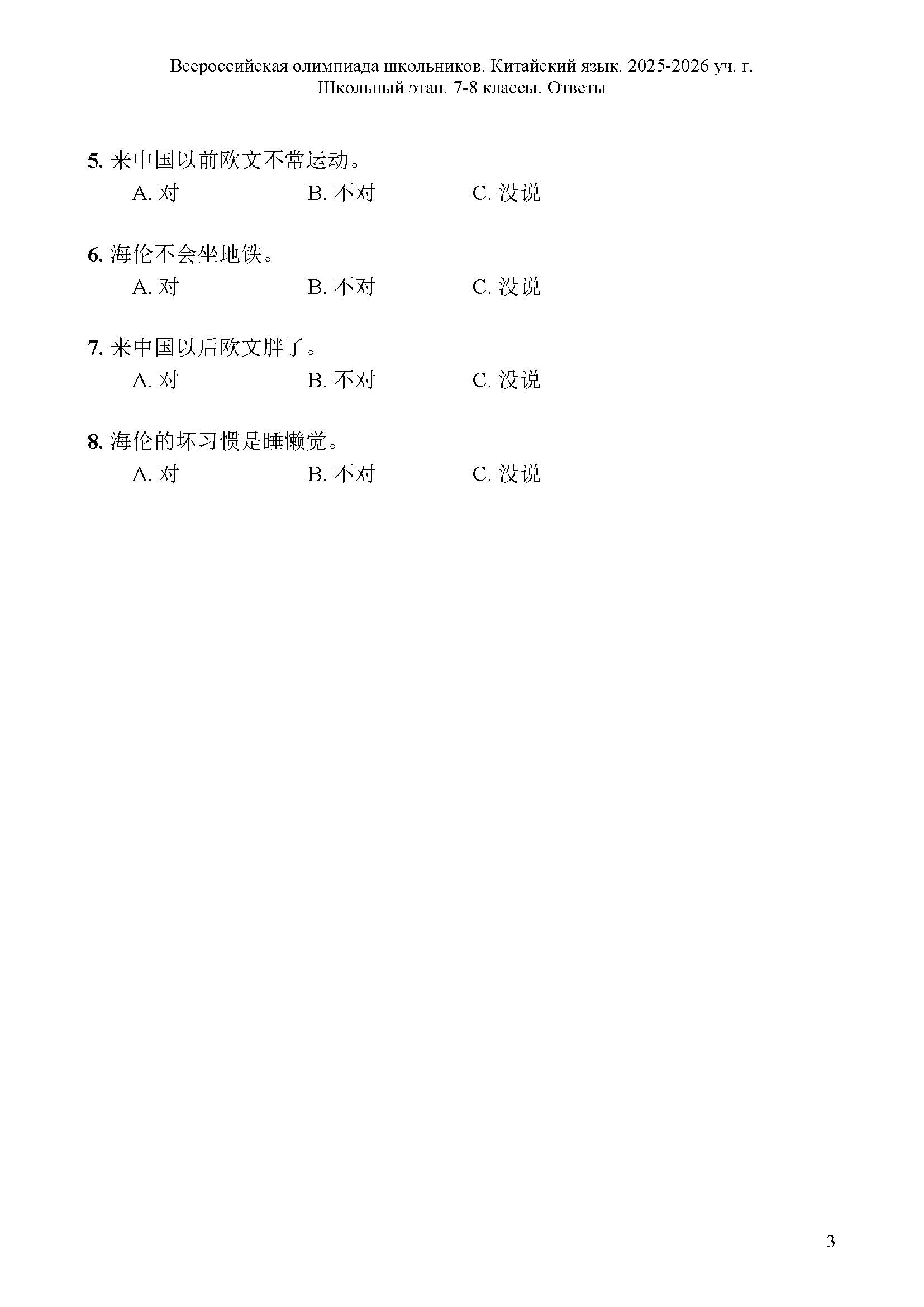 Всероссийская олимпиада школьников (ВсОШ) школьного этапа по Китайскому языку. Официальные задания, ответы и решения для 8 (восьмого) класса (задания и ответы)