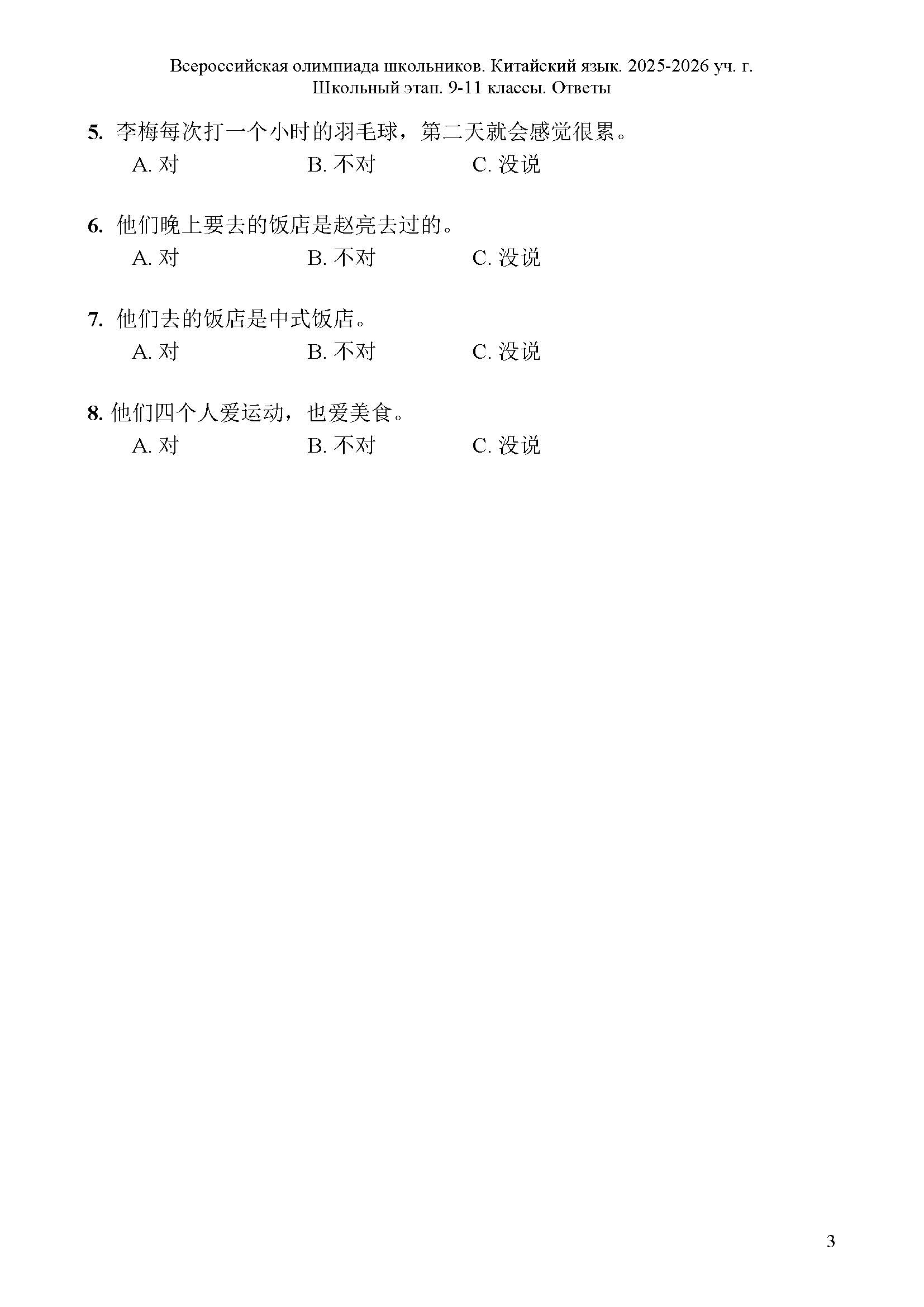 Всероссийская олимпиада школьников (ВсОШ) школьного этапа по Китайскому языку. Официальные задания, ответы и решения для 10 (десятого) класса (задания и ответы)