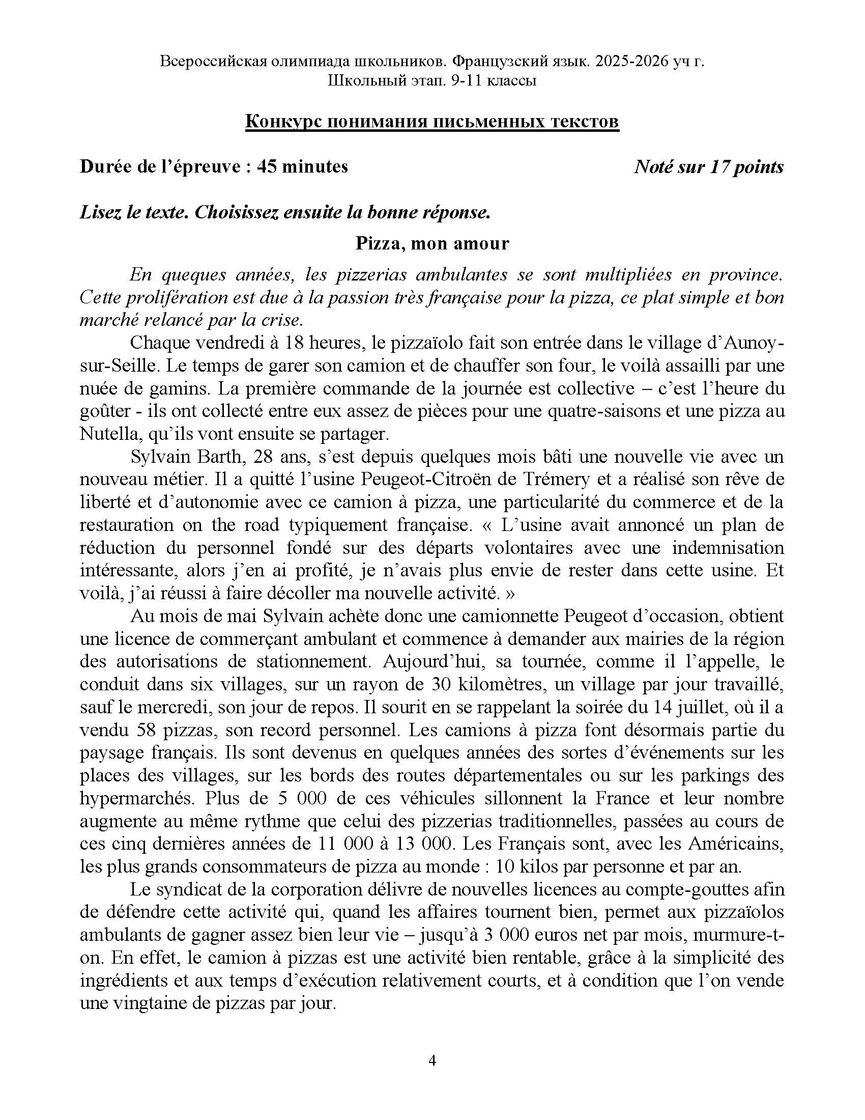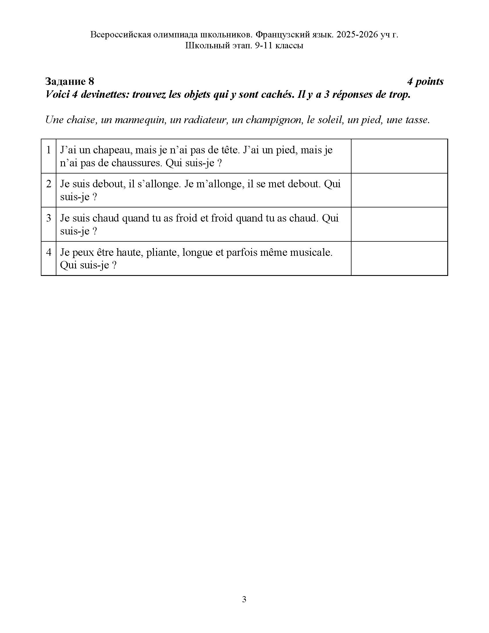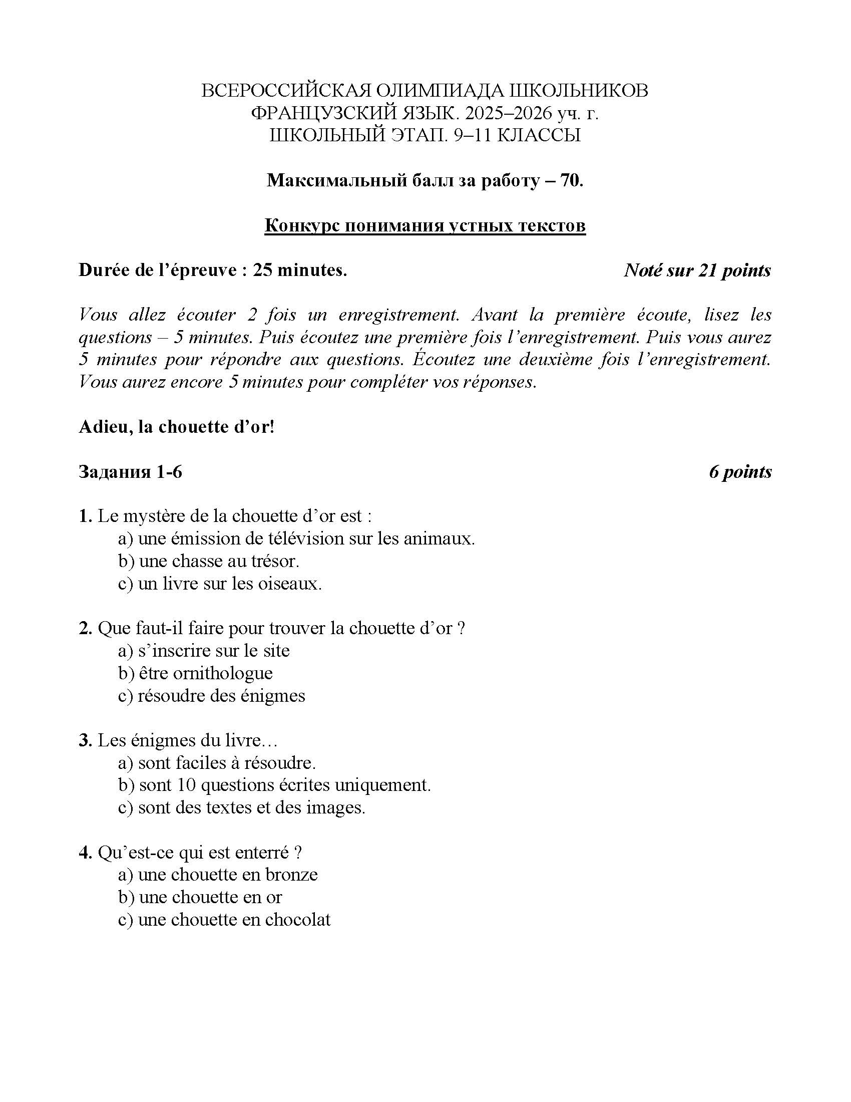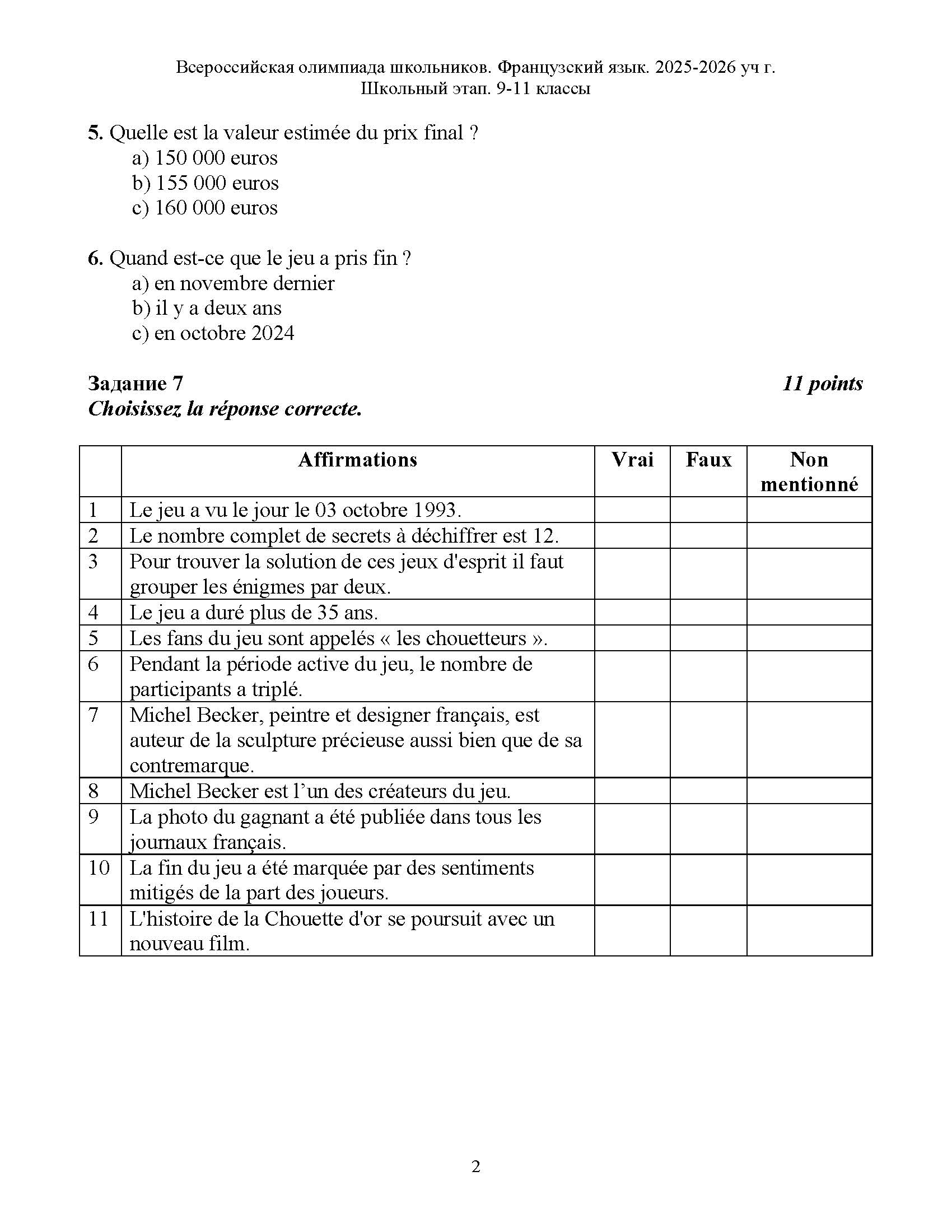 Всероссийская олимпиада школьников (ВсОШ) школьного этапа по Французскому языку. Официальные задания, ответы и решения для 10 (десятого) класса (задания и ответы)