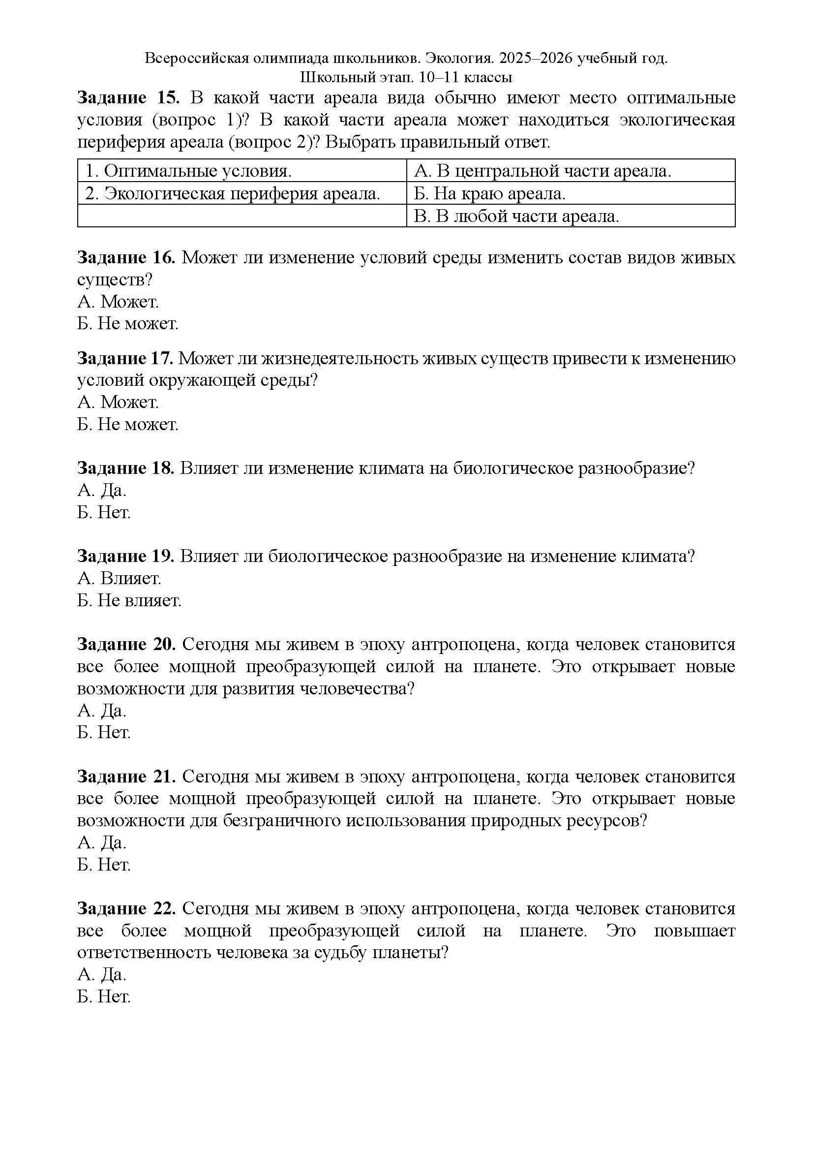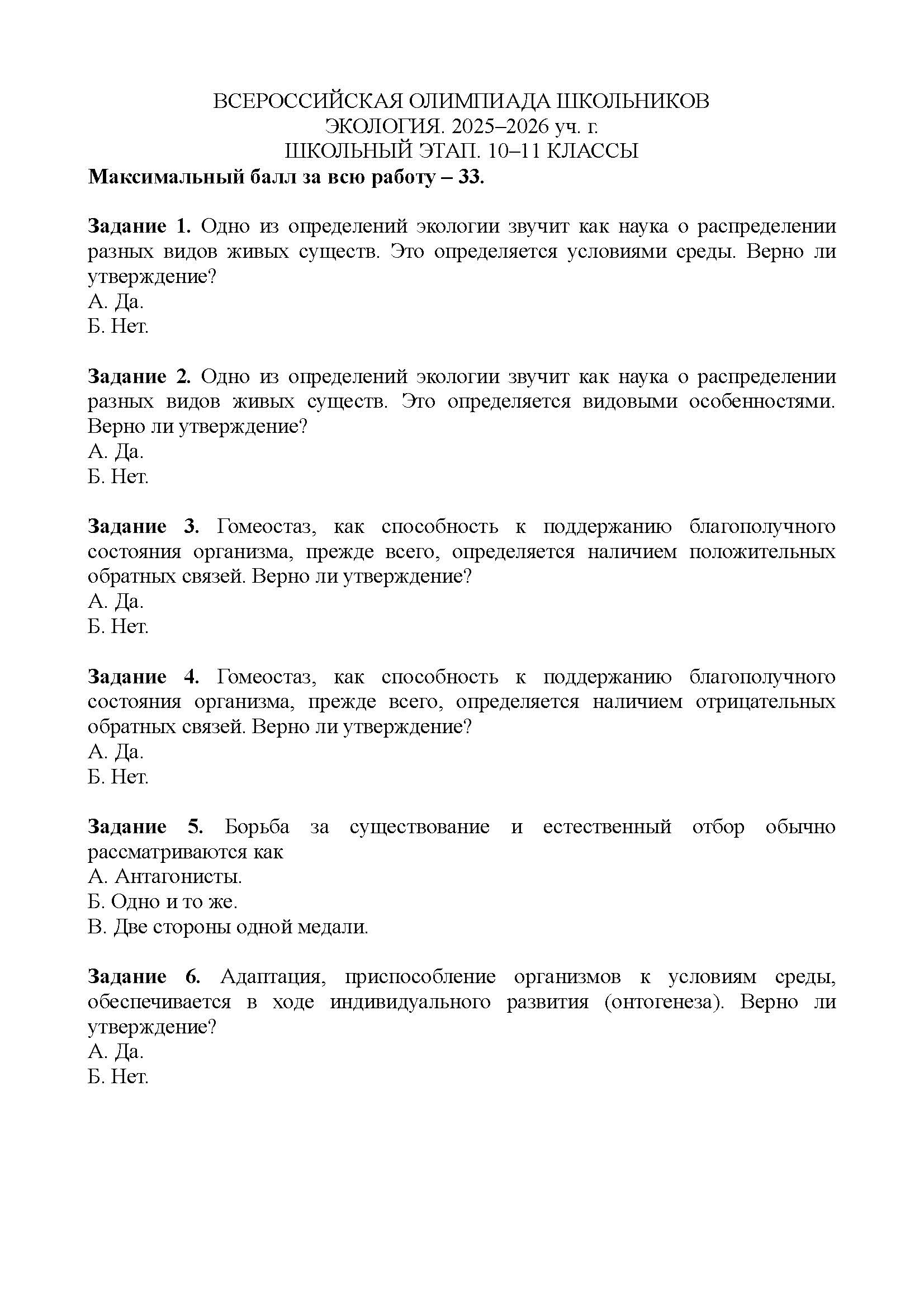 Всероссийская олимпиада школьников (ВсОШ) школьного этапа по Экологии. Официальные задания, ответы и решения для 10 (десятого) класса (задания и ответы)