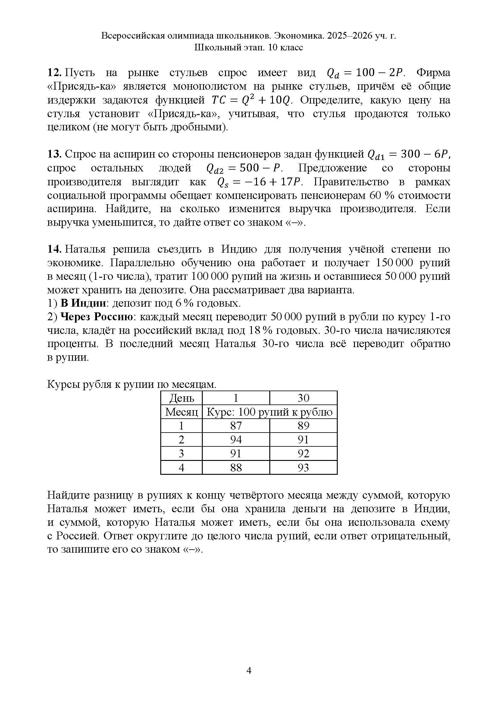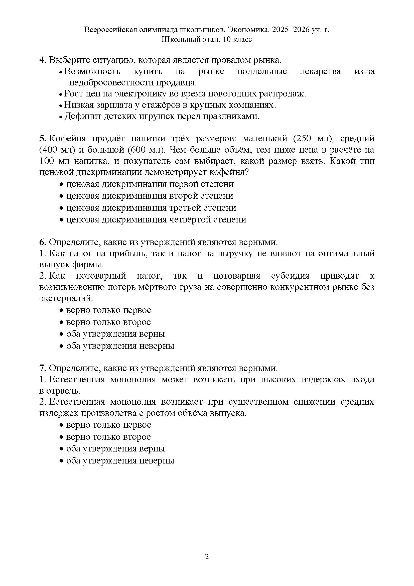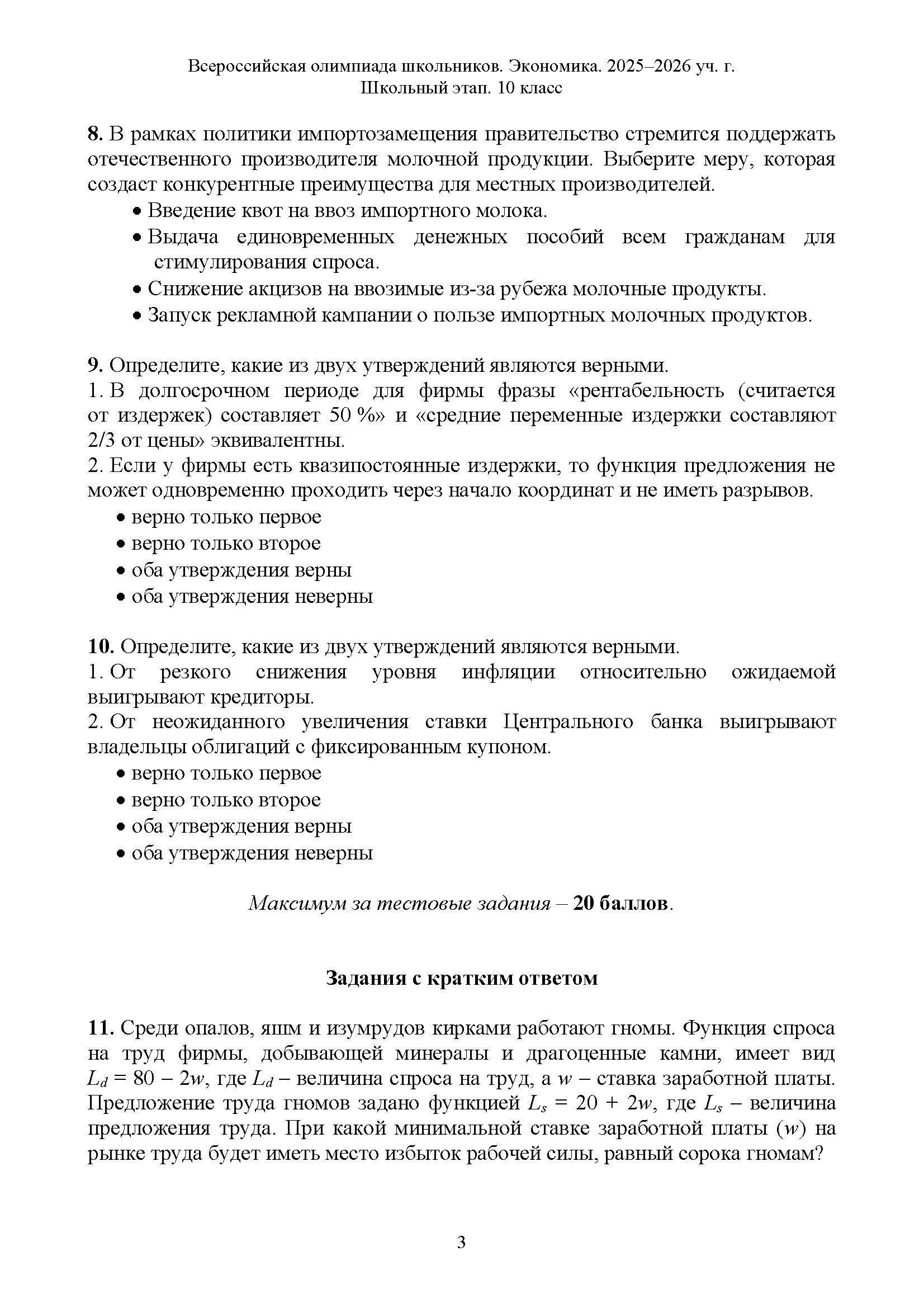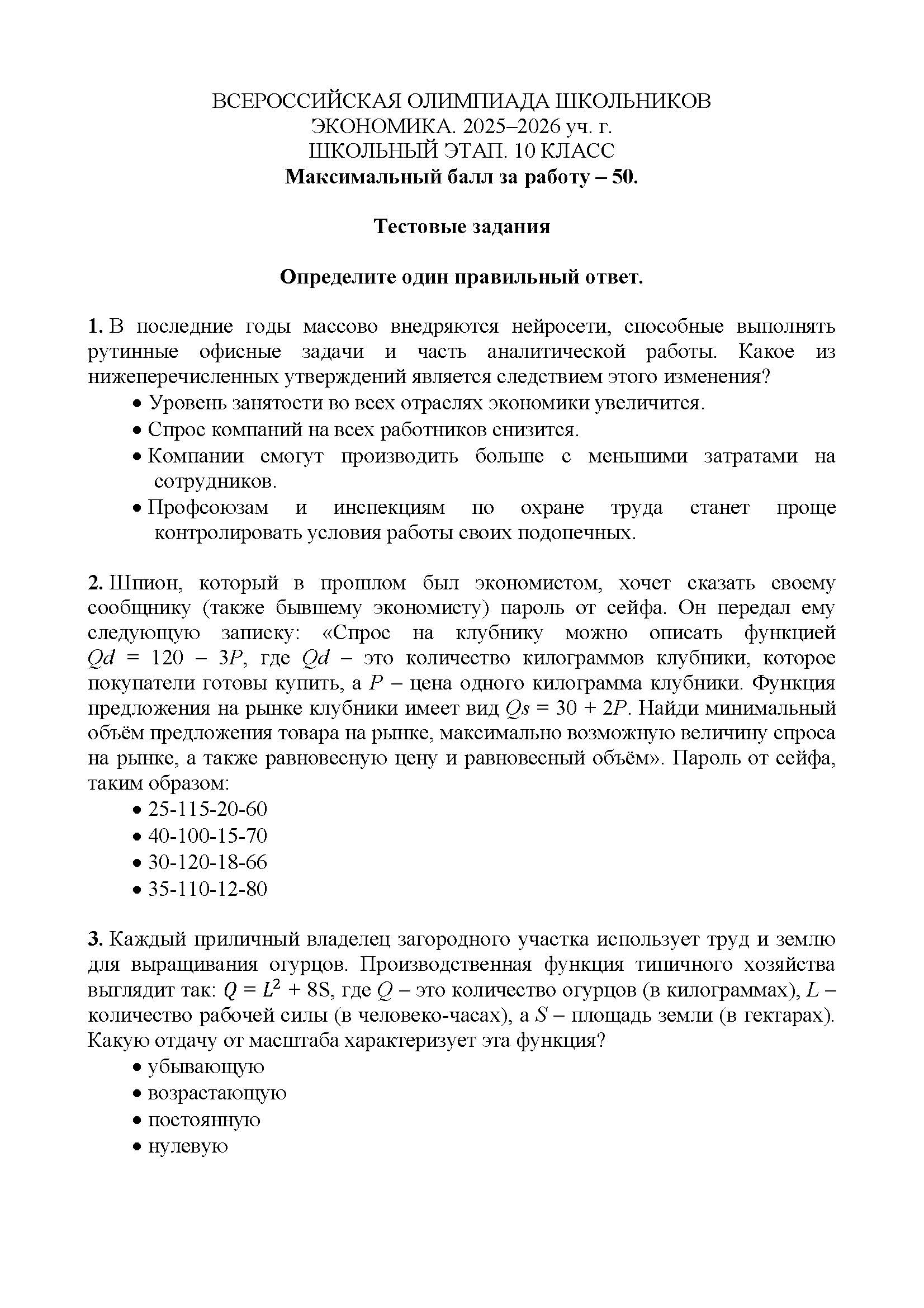 Всероссийская олимпиада школьников (ВсОШ) школьного этапа по Экономике. Официальные задания, ответы и решения для 10 (десятого) класса (задания и ответы)