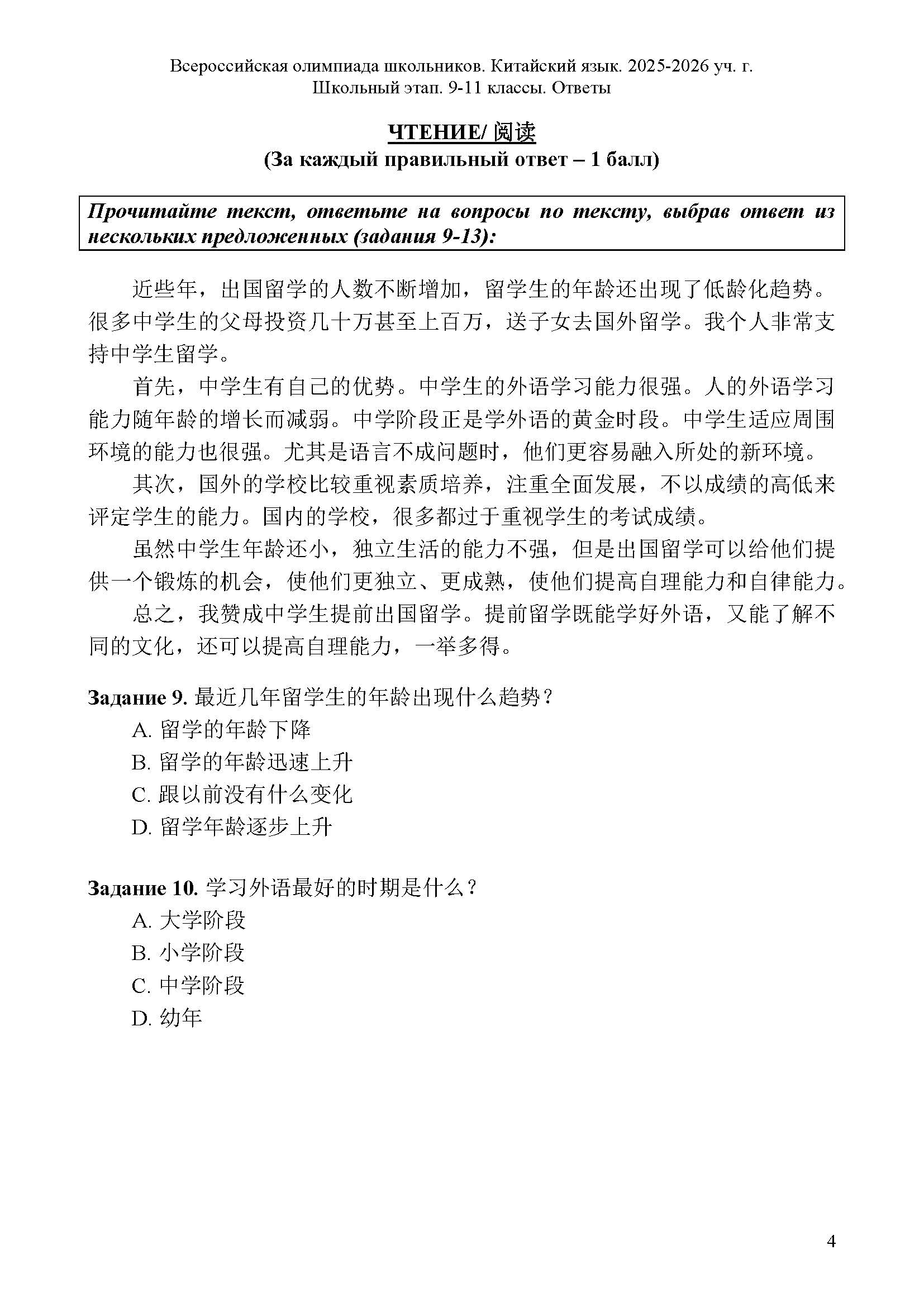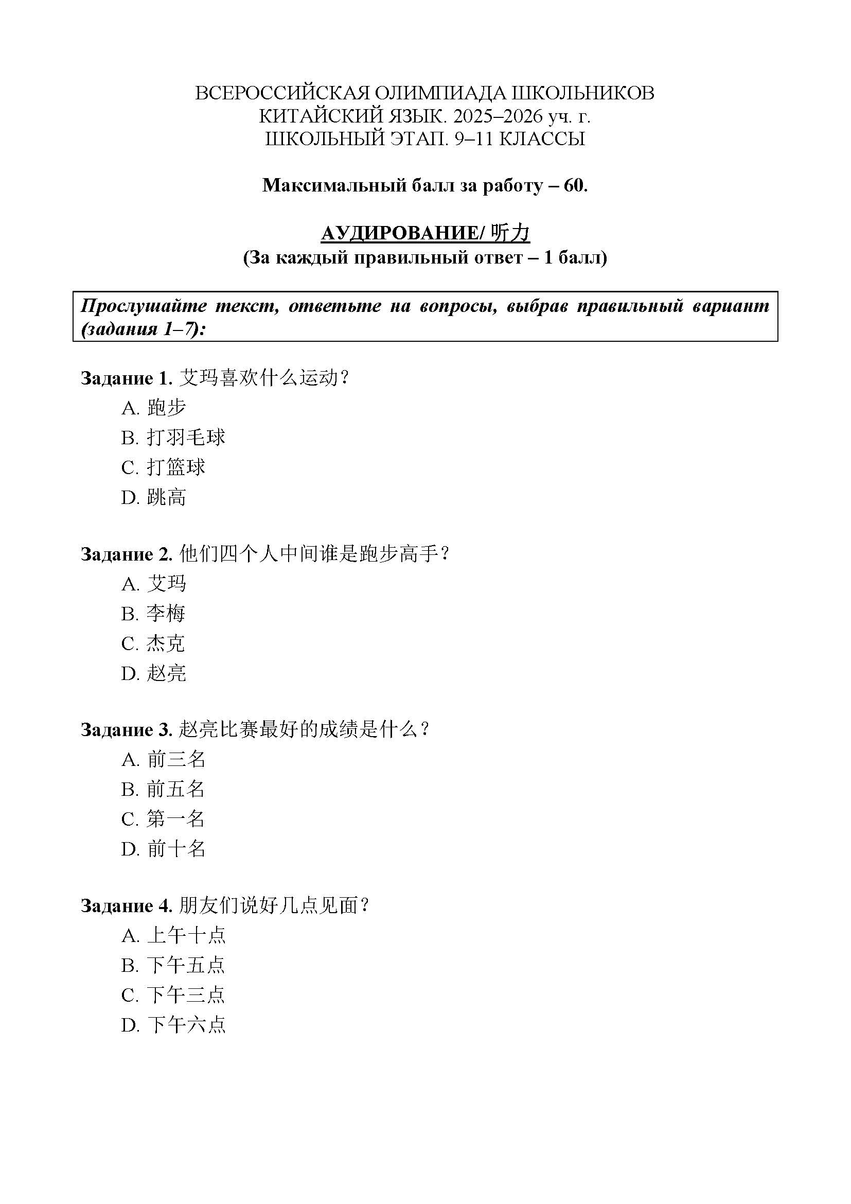 Всероссийская олимпиада школьников (ВсОШ) школьного этапа по Китайскому языку. Официальные задания, ответы и решения для 11 (одиннадцатого) класса (задания и ответы)
