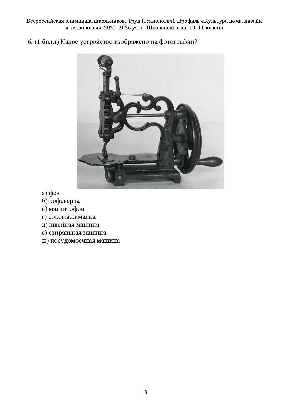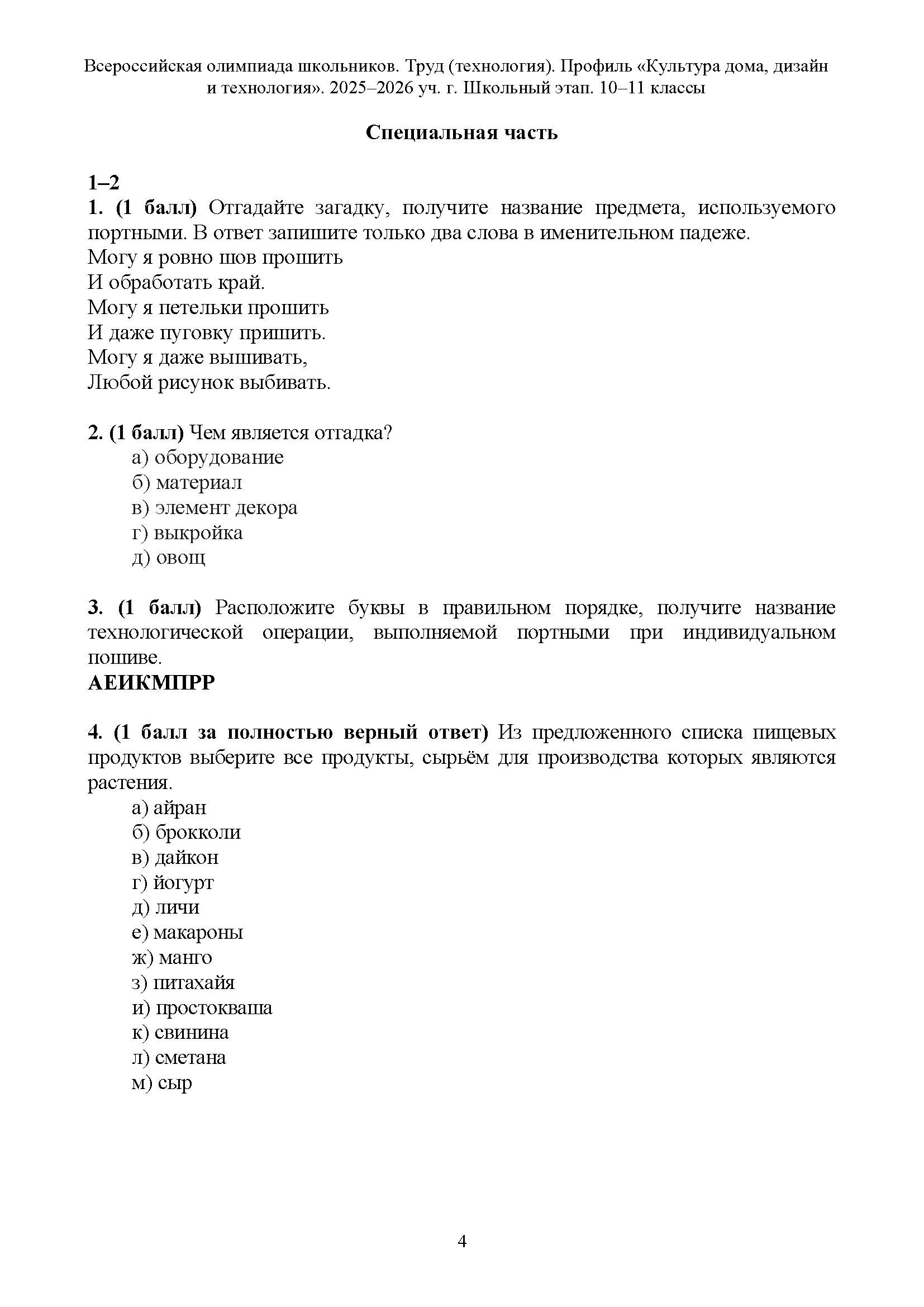 Всероссийская олимпиада школьников (ВсОШ) школьного этапа по Технологии. Официальные задания, ответы и решения для 11 (одиннадцатого) класса (задания и ответы)