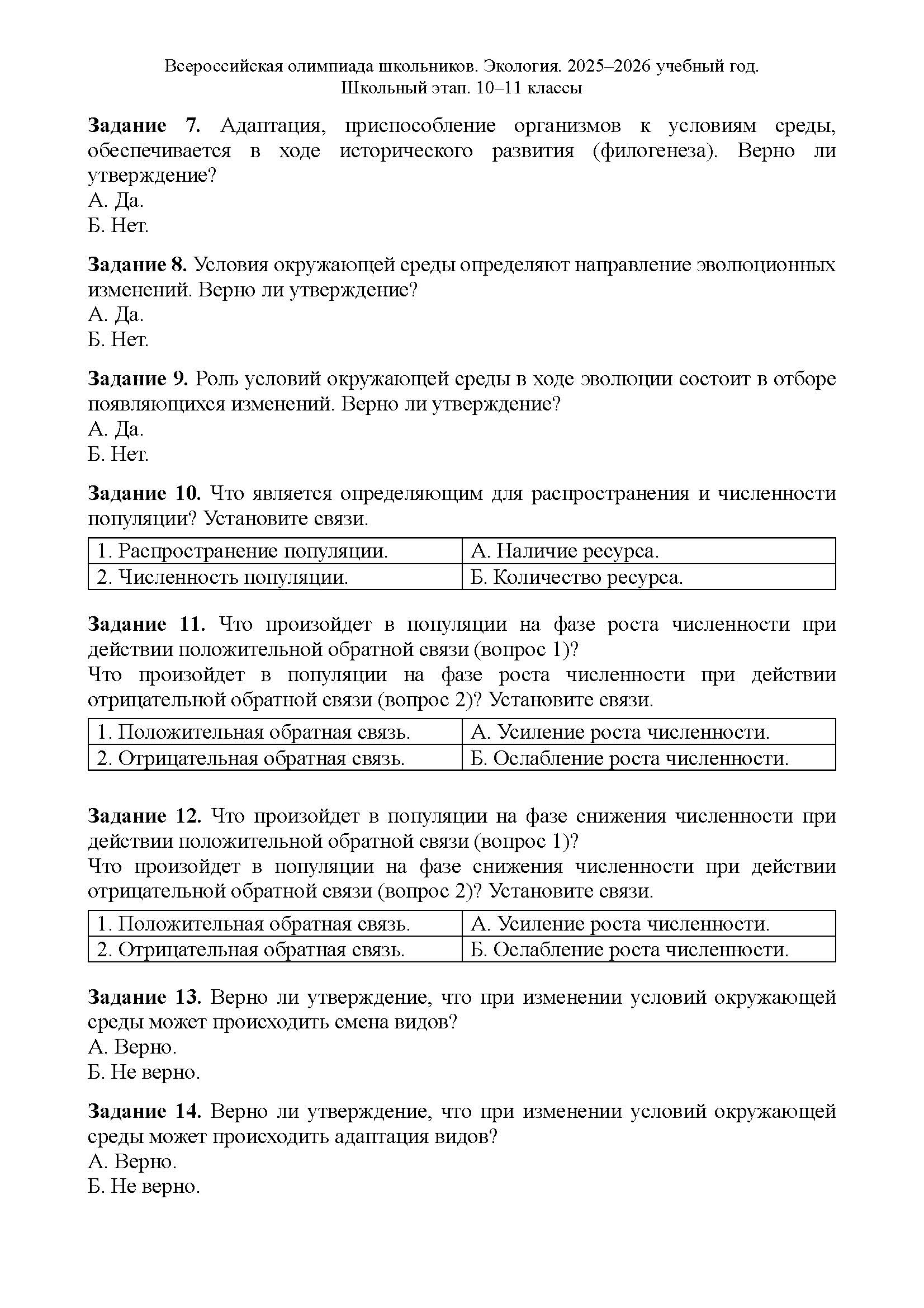 Всероссийская олимпиада школьников (ВсОШ) школьного этапа по Экологии. Официальные задания, ответы и решения для 11 (одиннадцатого) класса (задания и ответы)