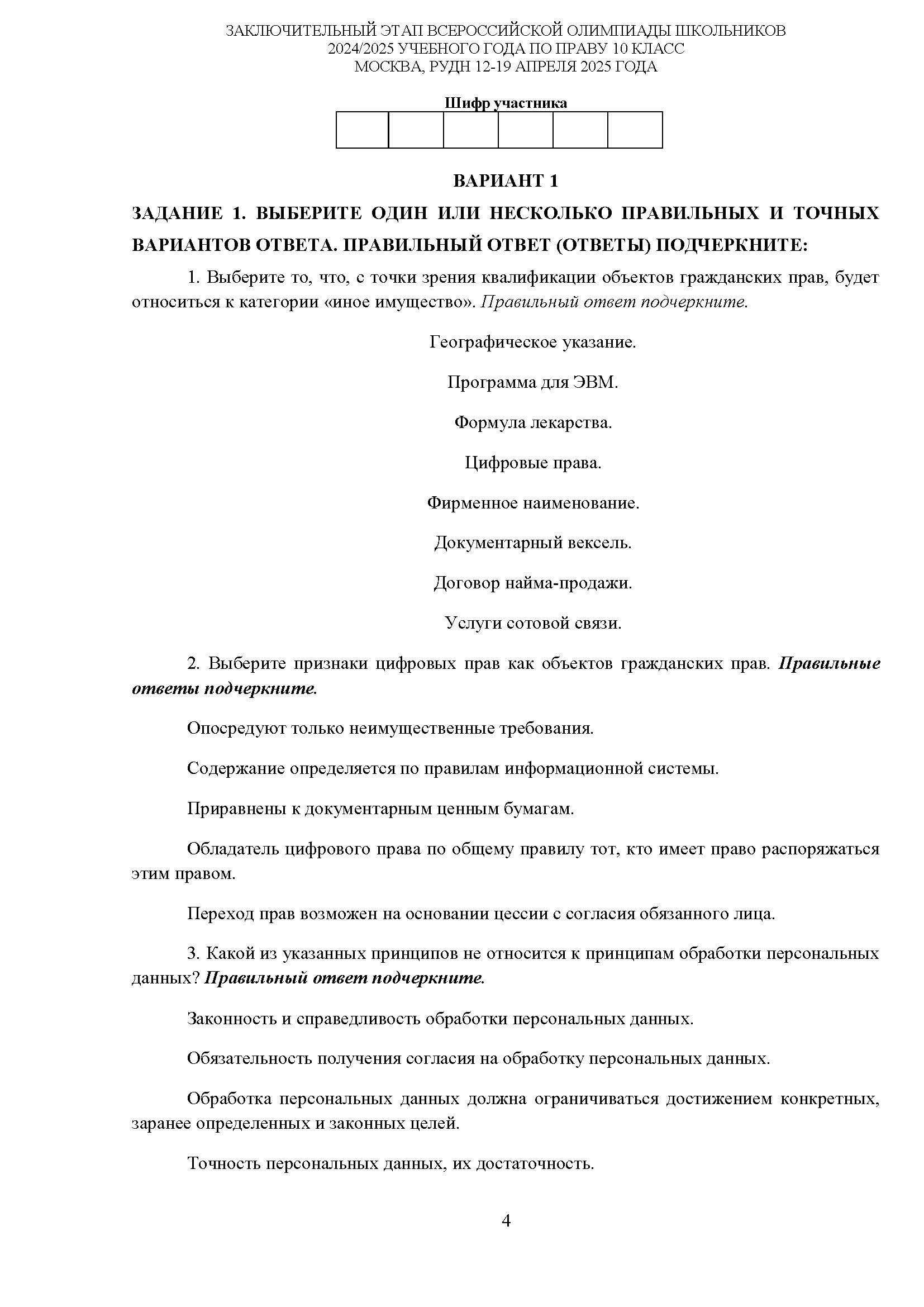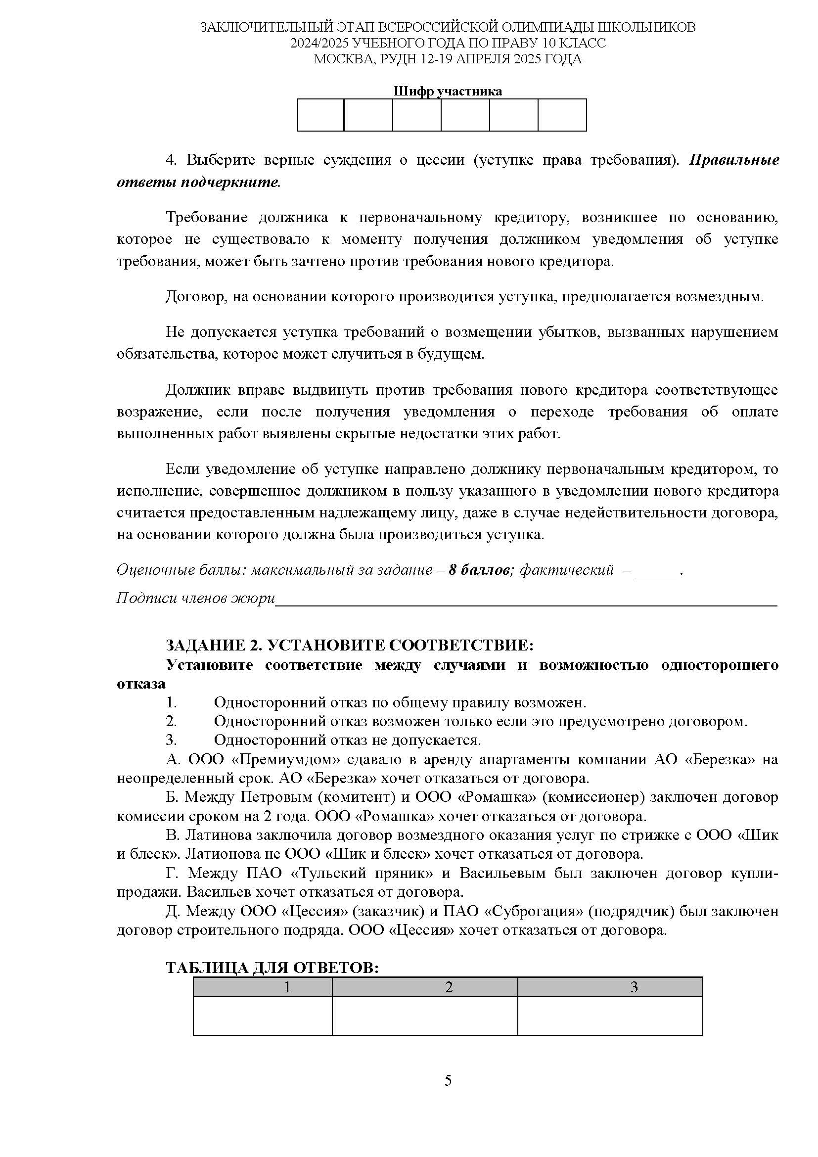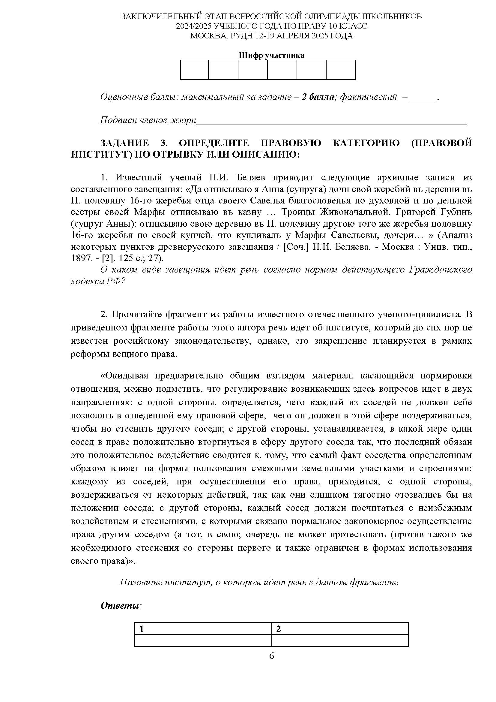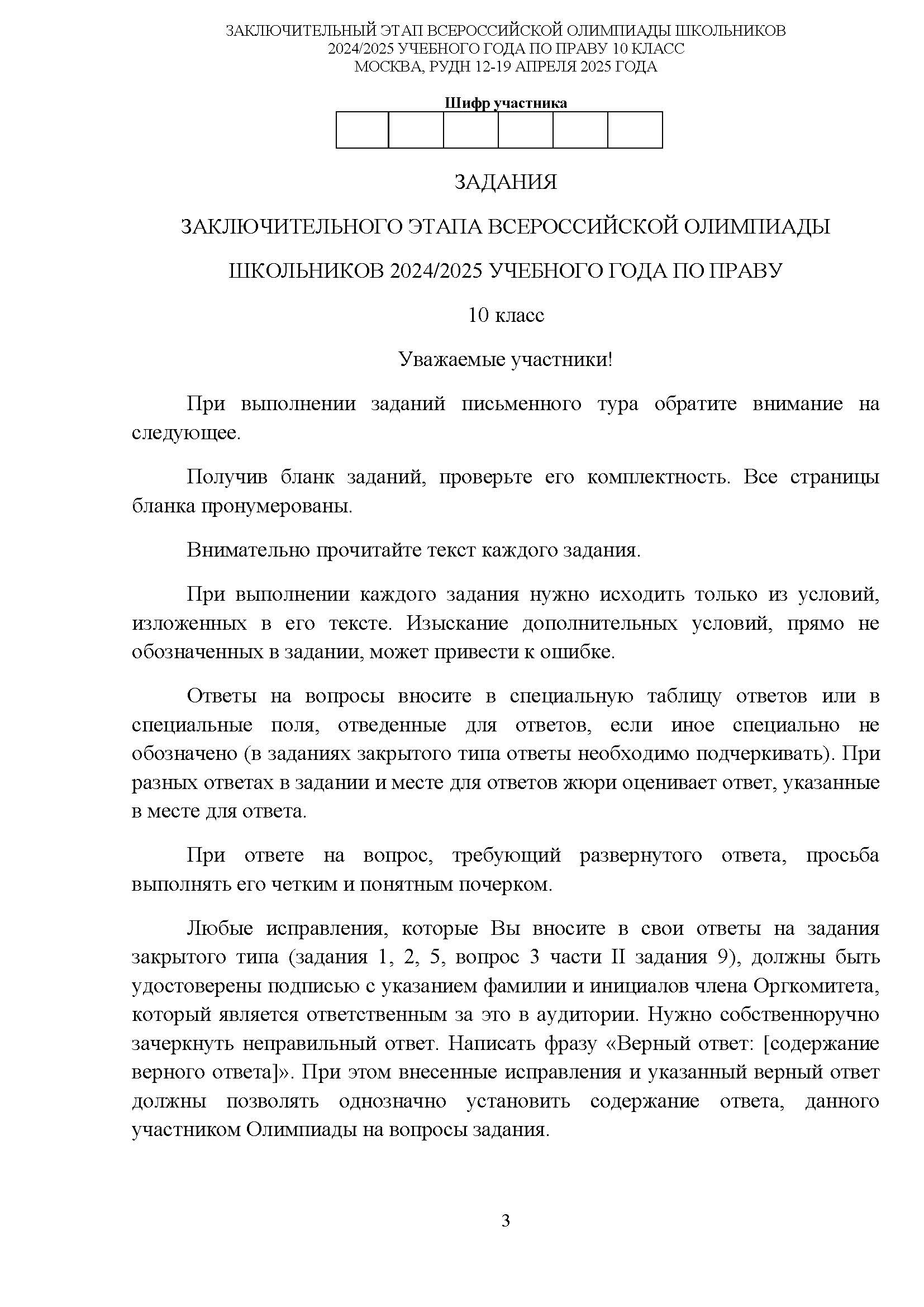 Всероссийская олимпиада школьников (ВсОШ) заключительного этапа по Праву. Официальные задания, ответы и решения для 10 (десятого) класса (задания и ответы)