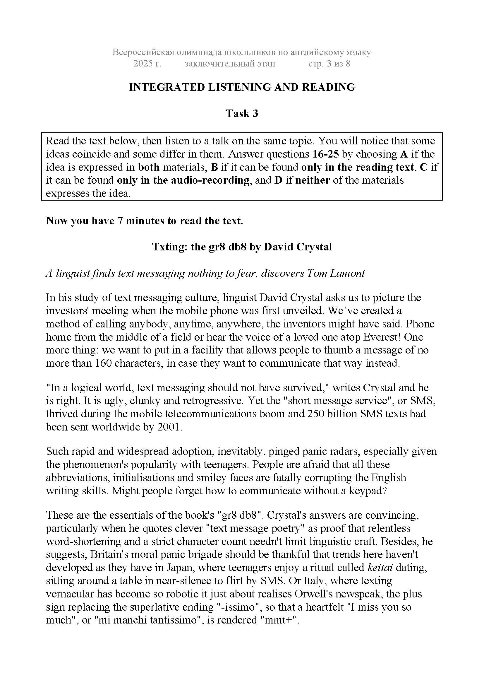 Всероссийская олимпиада школьников (ВсОШ) заключительного этапа по Английскому языку. Официальные задания, ответы и решения для 9 (девятого) класса (задания и ответы)