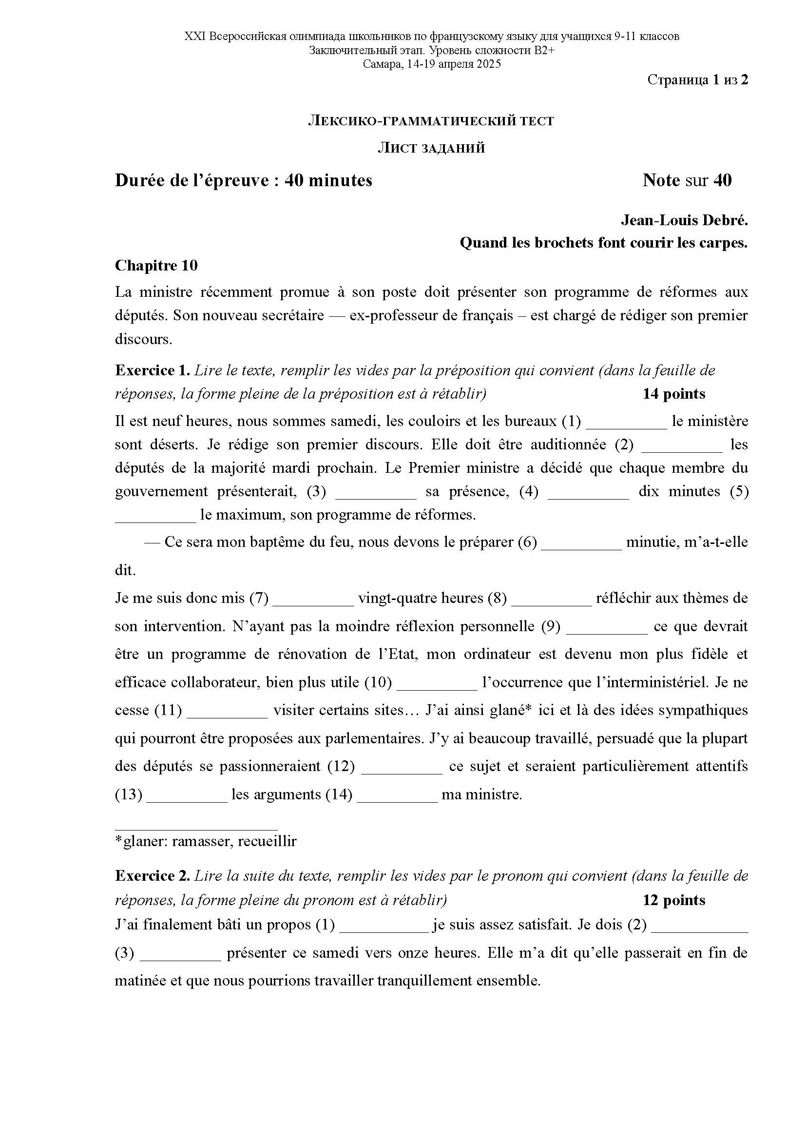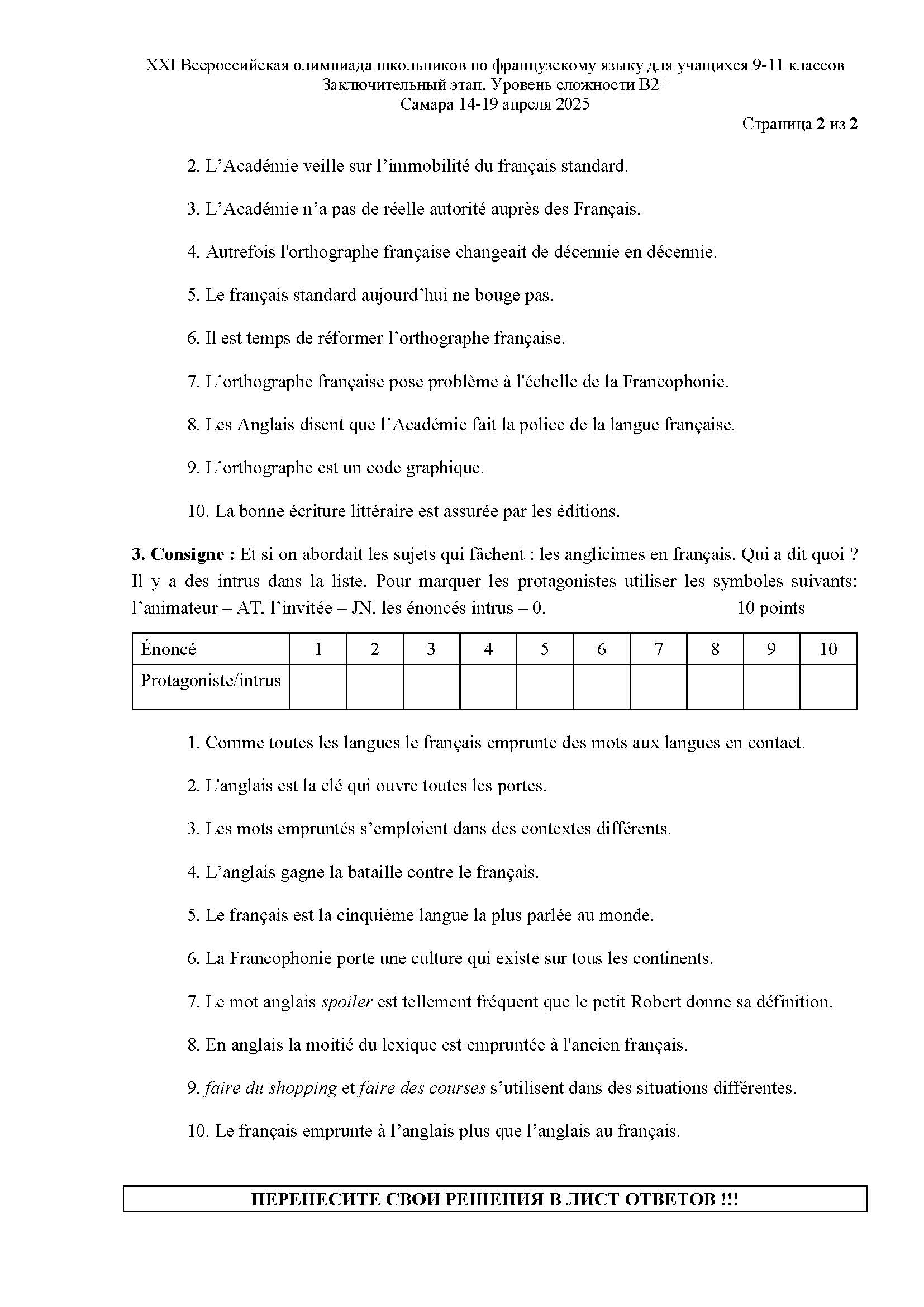 Всероссийская олимпиада школьников (ВсОШ) заключительного этапа по Французскому языку. Официальные задания, ответы и решения для 9 (девятого) класса (задания и ответы)